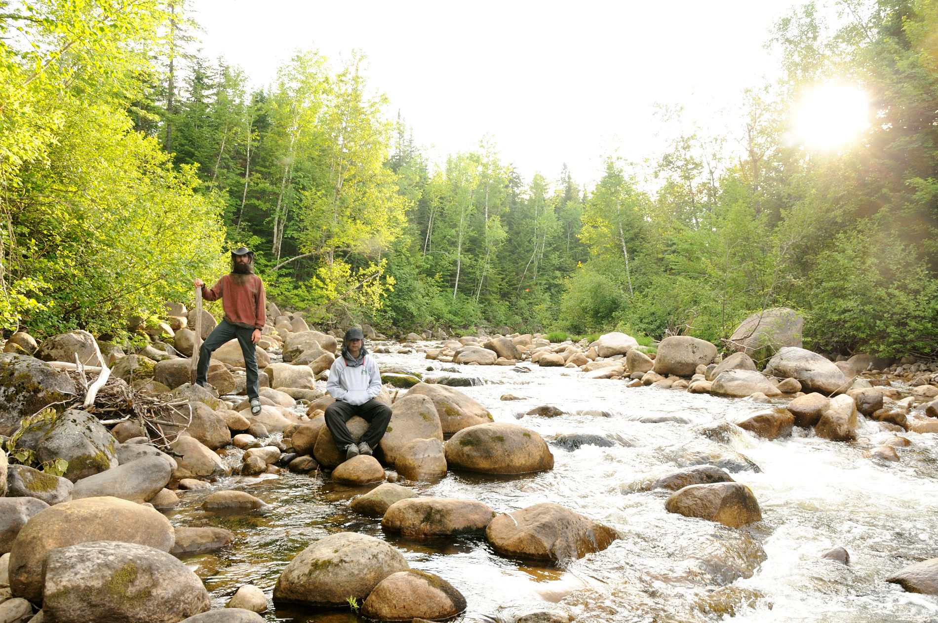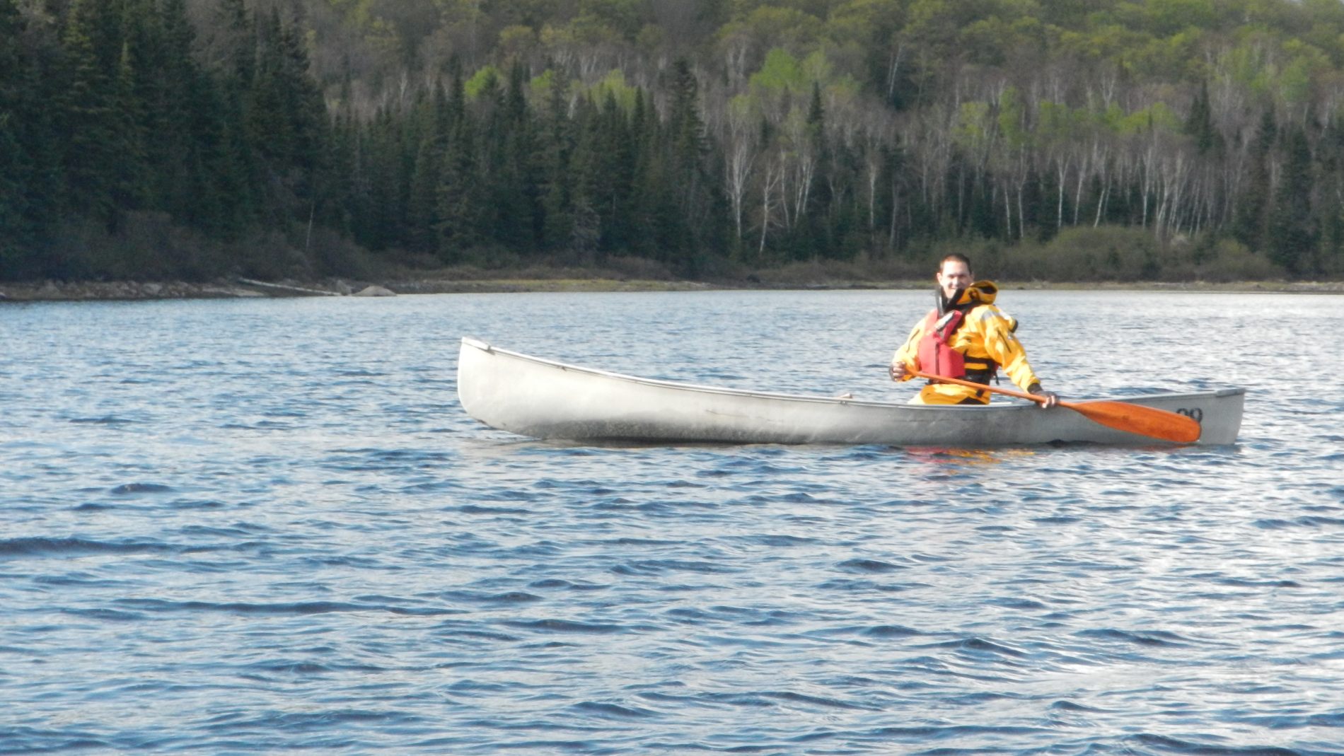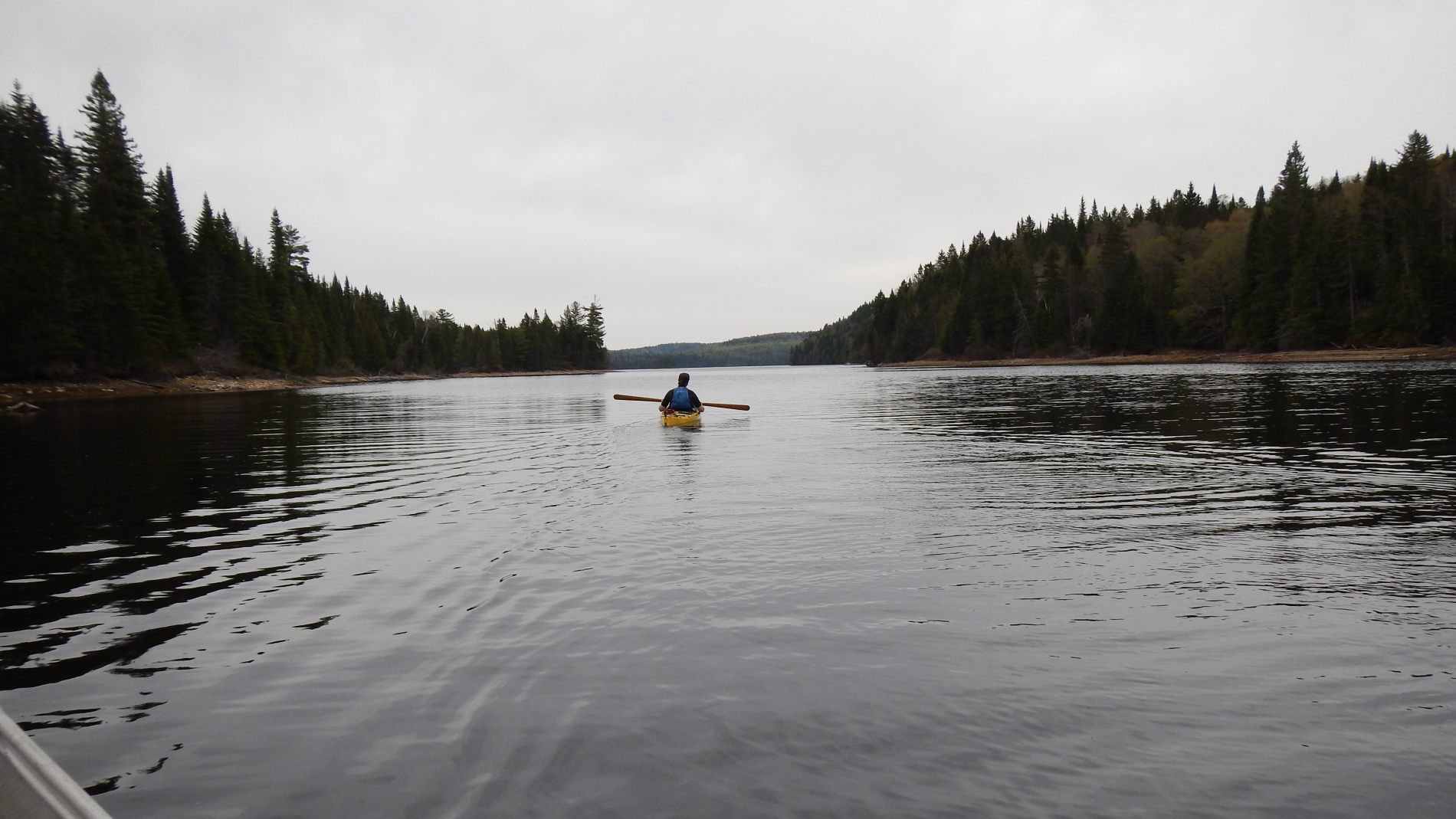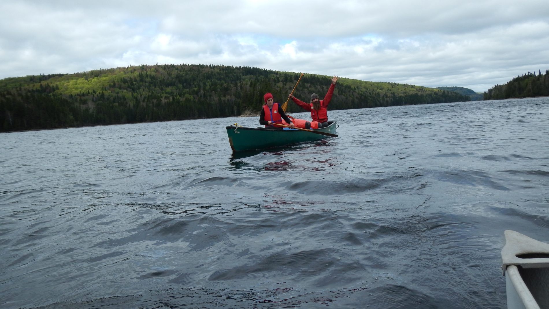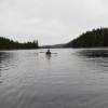Deuxième jour, un bon petit déjeuner pour commencer, avec du gruau aux fruits rouges, pomme cannelle et des oranges, le luxe pour nous. Départ le matin avec un vent dans le dos, magnifique 🙂 sur un lac encore calme, étroit et sinueux avec îles par-ci par-là. C’est parti pour l’exploration du lac et surtout la recherche du bout du Lac sans bout. A force de remonter une petite rivière qui se déverse dans le lac, on a fini par le trouver le bout, on ne pouvait pas continuer, car on a bien essayé de remonter les rapides, mais c’était peine perdue. Contents d’avoir trouvé le bout du lac sans bout, on revient à notre camp de base pour un petit cours de pèche à la mouche avec Louis-Philippe, où Jeremy sera le seul à pêcher un poisson 🙂 Louis-Philippe passe une partie de la soirée à chercher où cacher la géocache qu’il a prise avec lui, avec des allumettes, du papier, un crayon et un petit couteau.