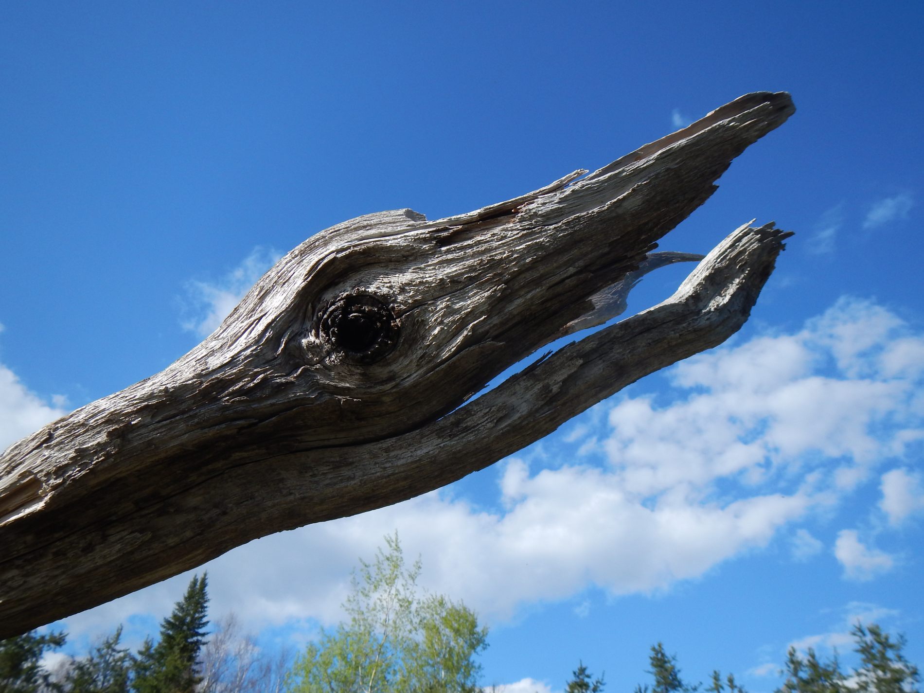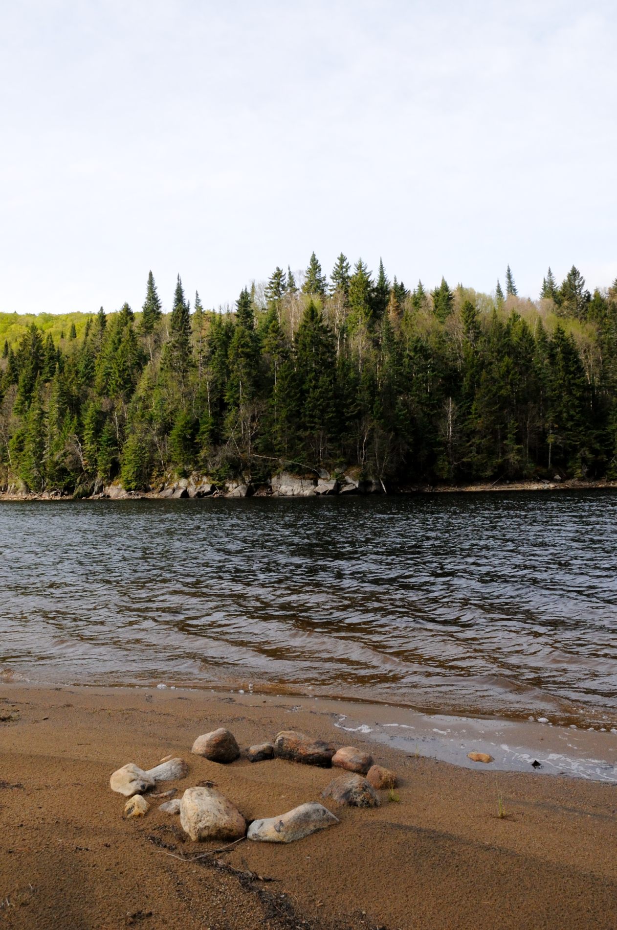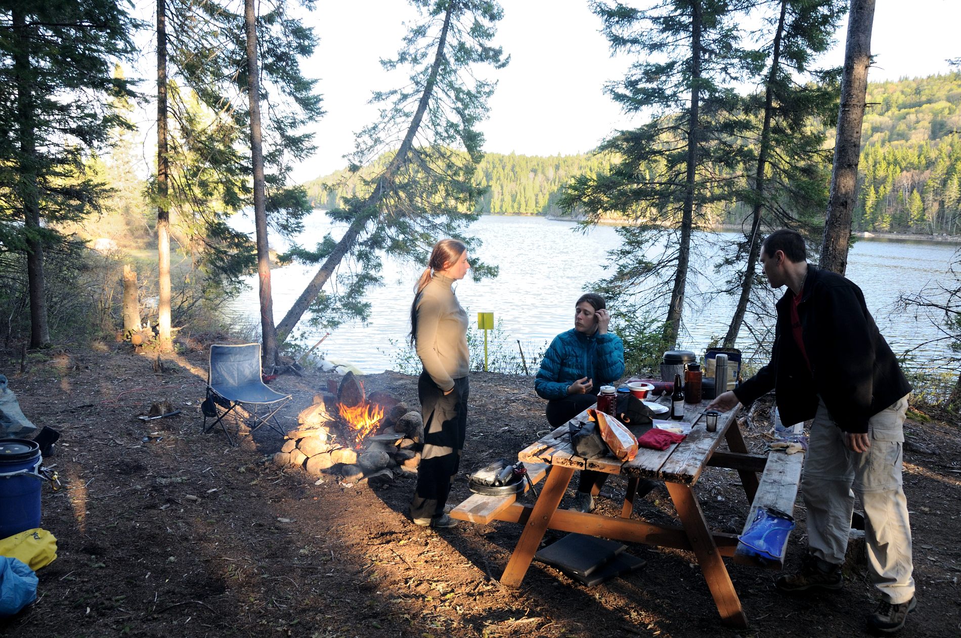 Premier jour, trajet de 2 heures et une 1/2 heure de piste de graviers, terre, roches de 20 cm, des trous, des petits cours d’eau, tout ça avec les embarcations sur les toits, bref, un vrai safari 😉 Une fois arrivés, chargement des embarcations, direction une petite île au milieu du lac à 2 heures de pagaie. Chouette, le vent souffle dans notre sens, un vrai plaisir 🙂 Installation du campement et soirée au bord du feu. Pour Louis-Philippe, c’est la recherche de sa géocache qu’il a laissée quelques années auparavant, sauf qu’il ne sait plus où elle était 😉 Il finit par se résoudre à se dire que quelqu’un l’avait prise. Alors, on n’a pas vraiment fait attention à ce qu’ils ont mis dans leurs barils, et c’est là qu’on découvre la notion toute différente de ‘camping’. Pour nous, c’est poids et encombrement minimum, pour eux, c’est les canots qui portent et on ne se refuse rien 😉