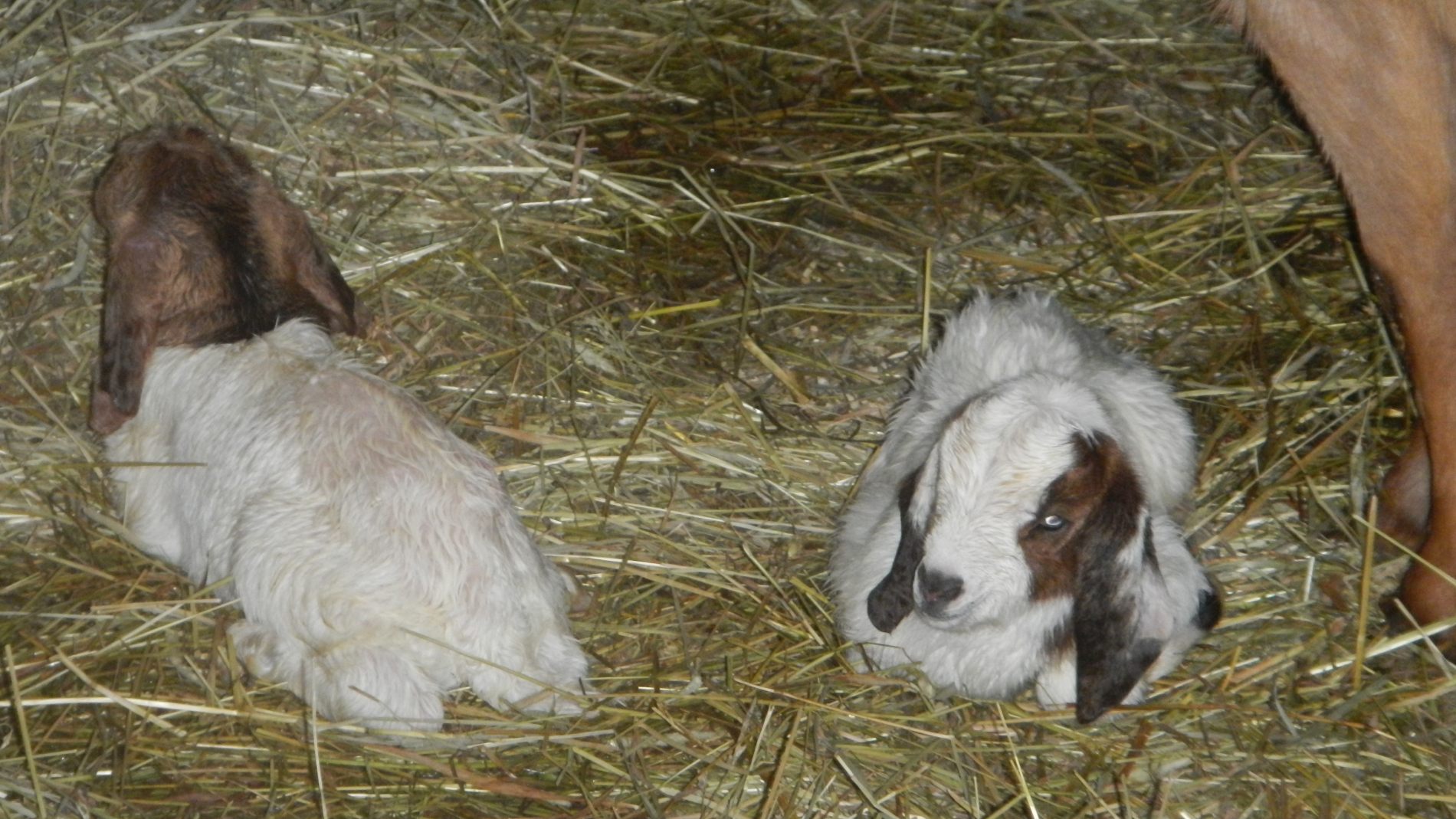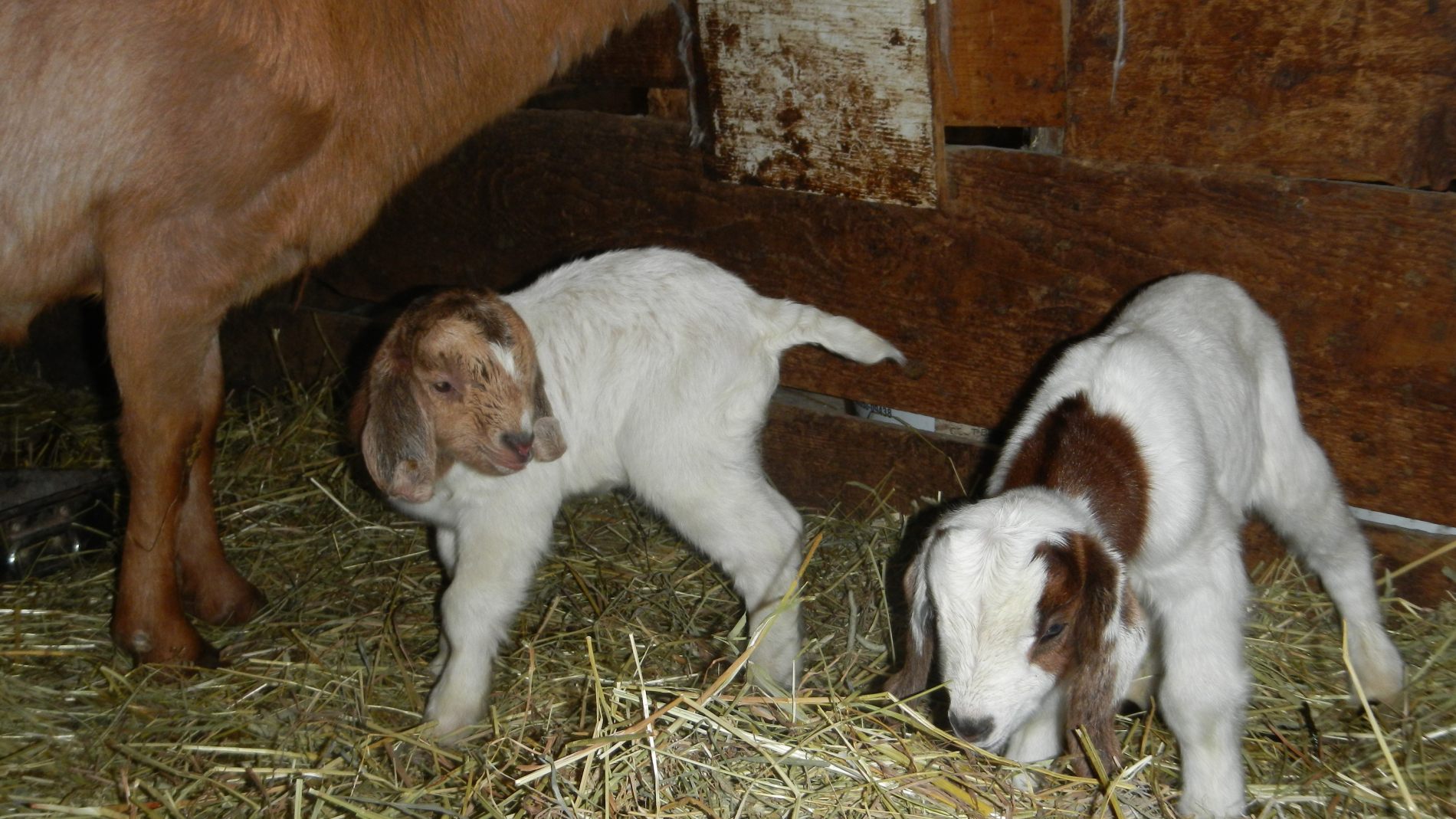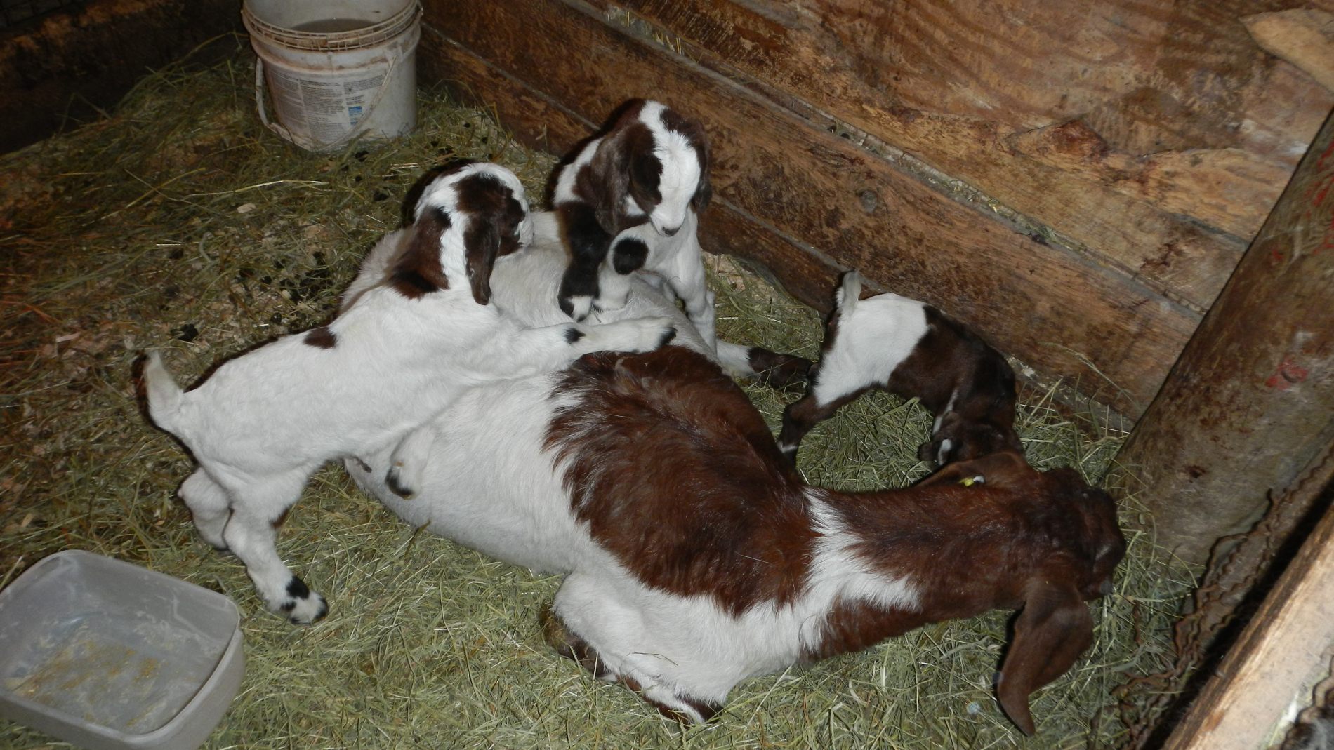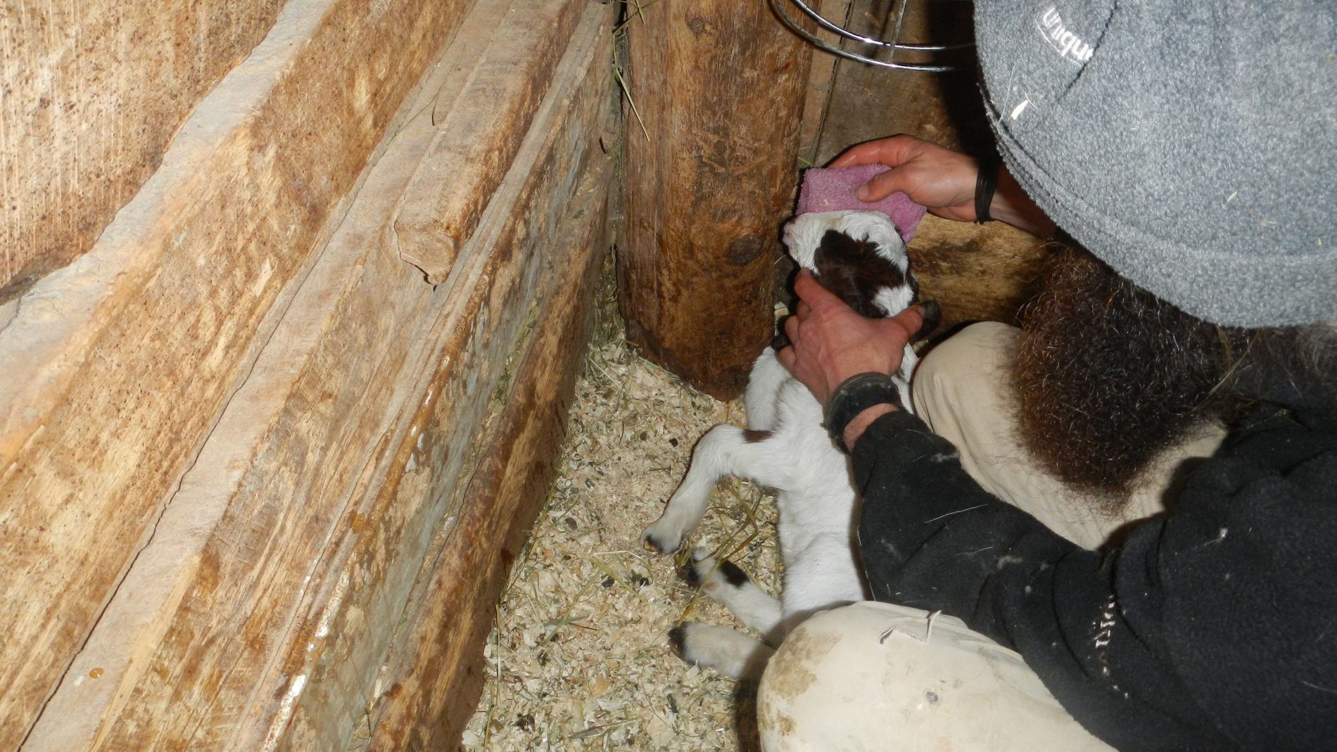 Trois jours plus tard, on est toujours aux aguets pour la dernière chèvre qui doit encore mettre bas. Quand on repasse par hasard dans l’étable, une heure après notre dernier passage, elle lèche ses petits. Elle en a eu 3, mais un est décédé parce qu’il est resté dans la poche de placenta et n’a pas su respirer. On appelle Céline d’urgence, qui déchire la poche, mais il est trop tard 🙁 peut-être la nature fait-elle bien sa sélection naturelle… Contents de voir que la chèvre s’occupe bien de ses chevreaux 🙂