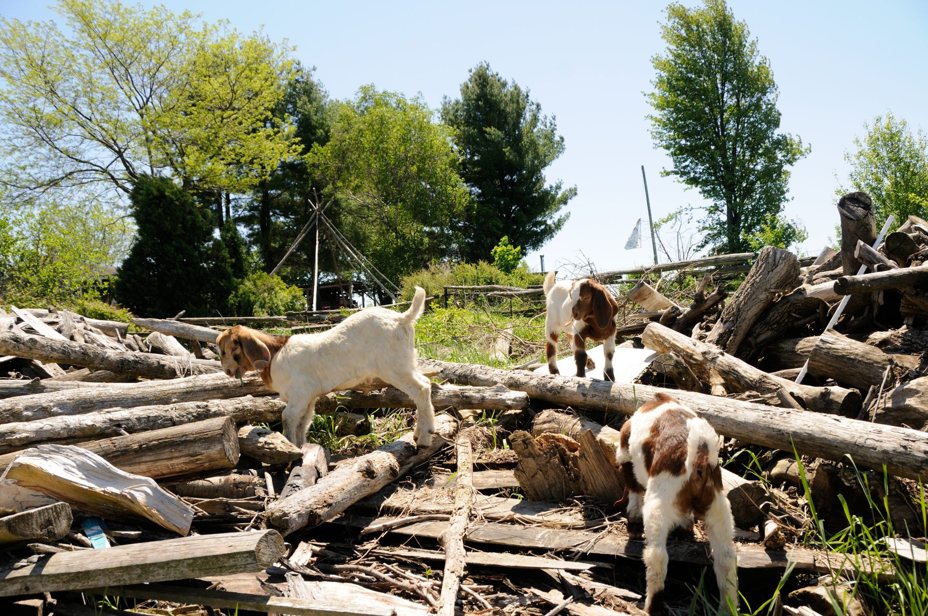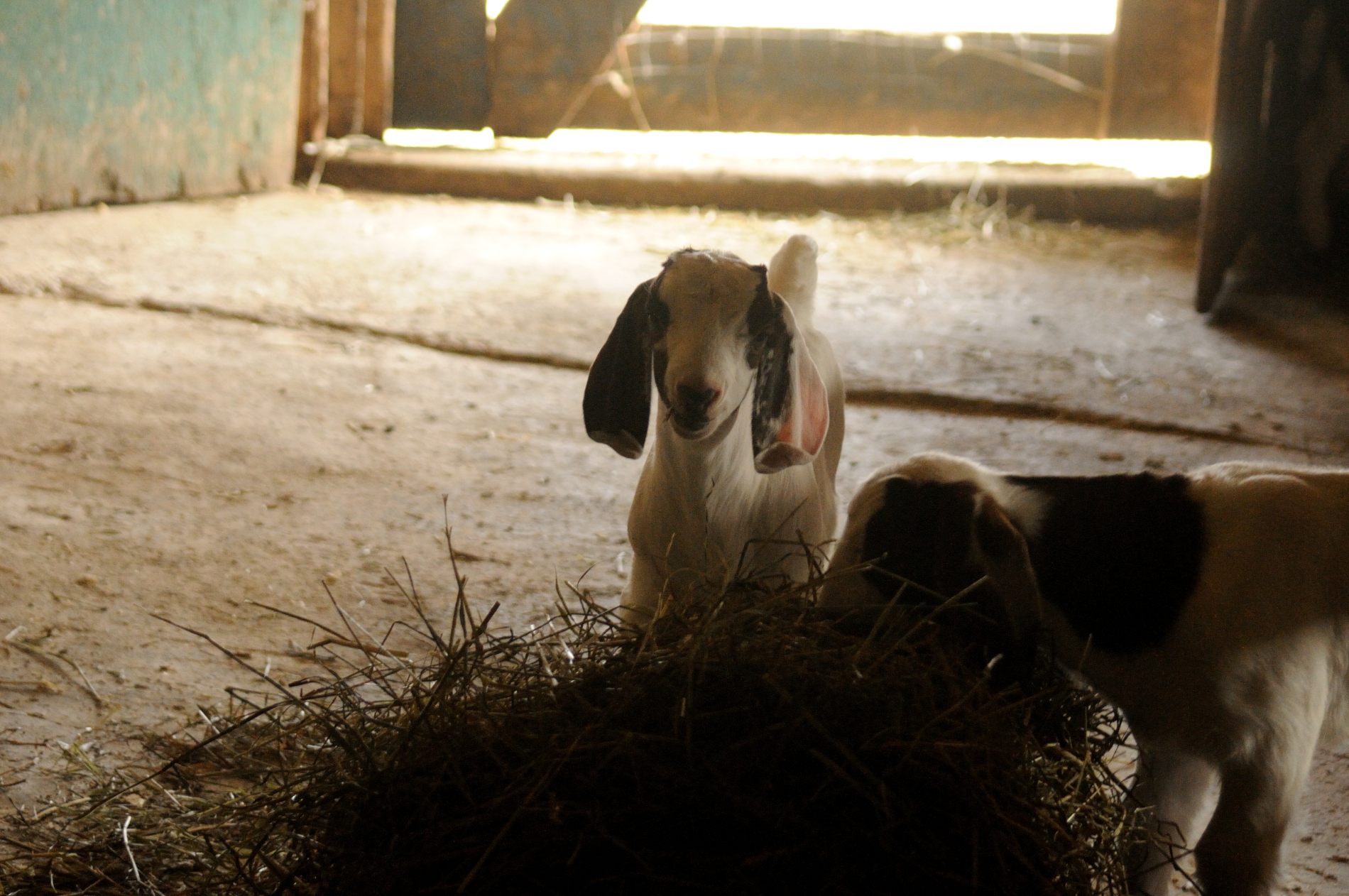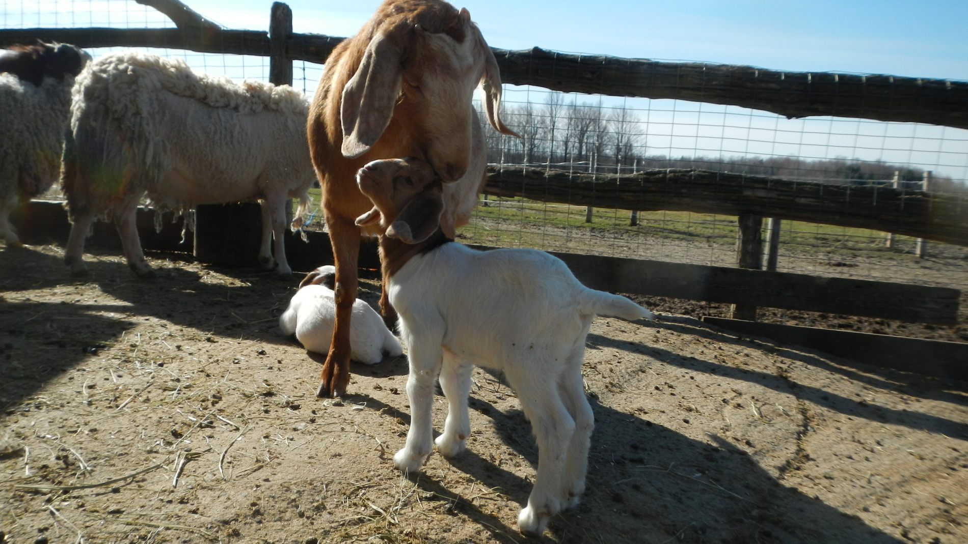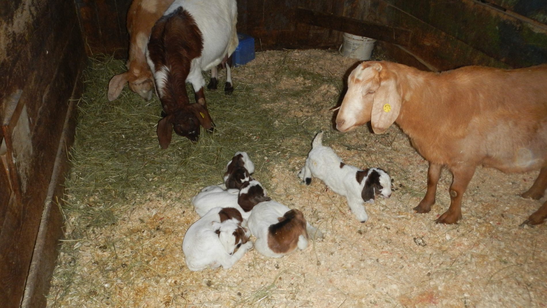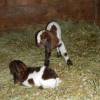 Trois jours plus tard, on est toujours aux aguets pour la dernière chèvre qui doit encore mettre bas. Quand on repasse par hasard dans l’étable, une heure après notre dernier passage, elle lèche ses petits. Elle en a eu 3, mais un est décédé parce qu’il est resté dans la poche de placenta et n’a pas su respirer. On appelle Céline d’urgence, qui déchire la poche, mais il est trop tard 🙁 peut-être la nature fait-elle bien sa sélection naturelle… Contents de voir que la chèvre s’occupe bien de ses chevreaux 🙂