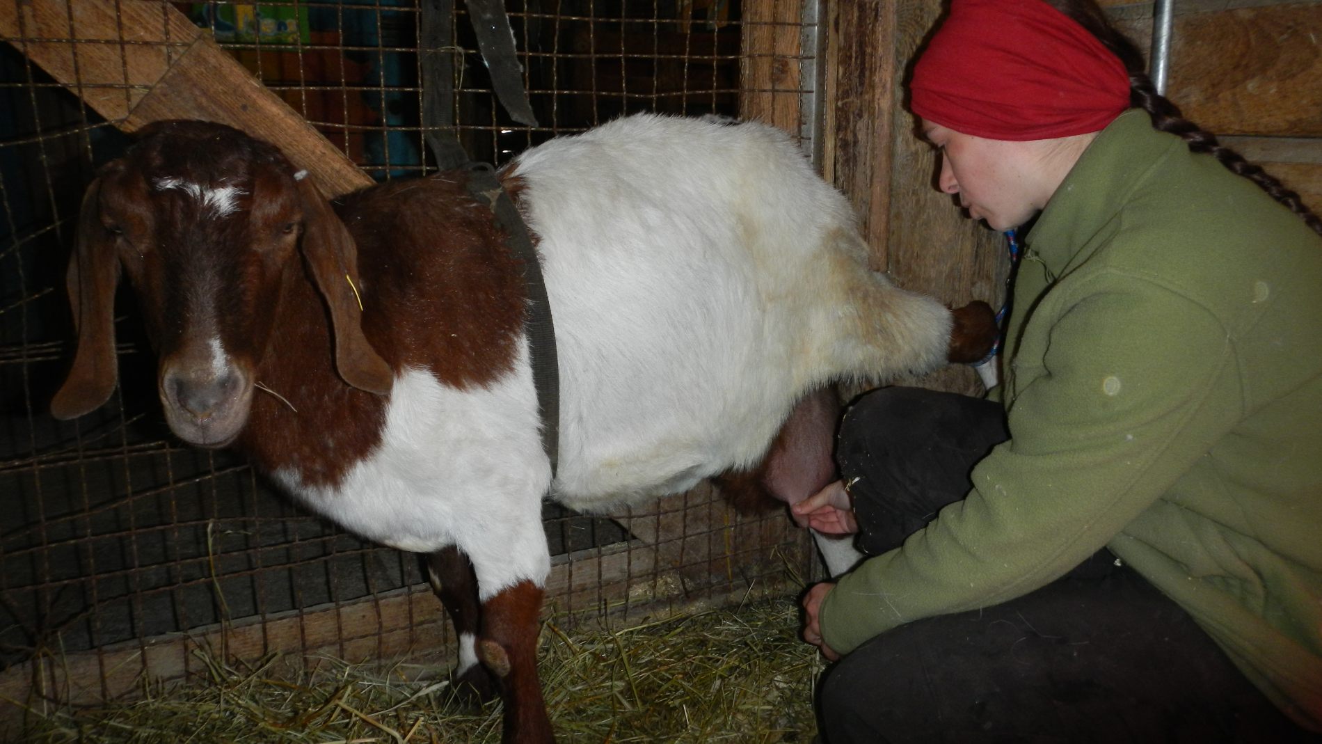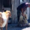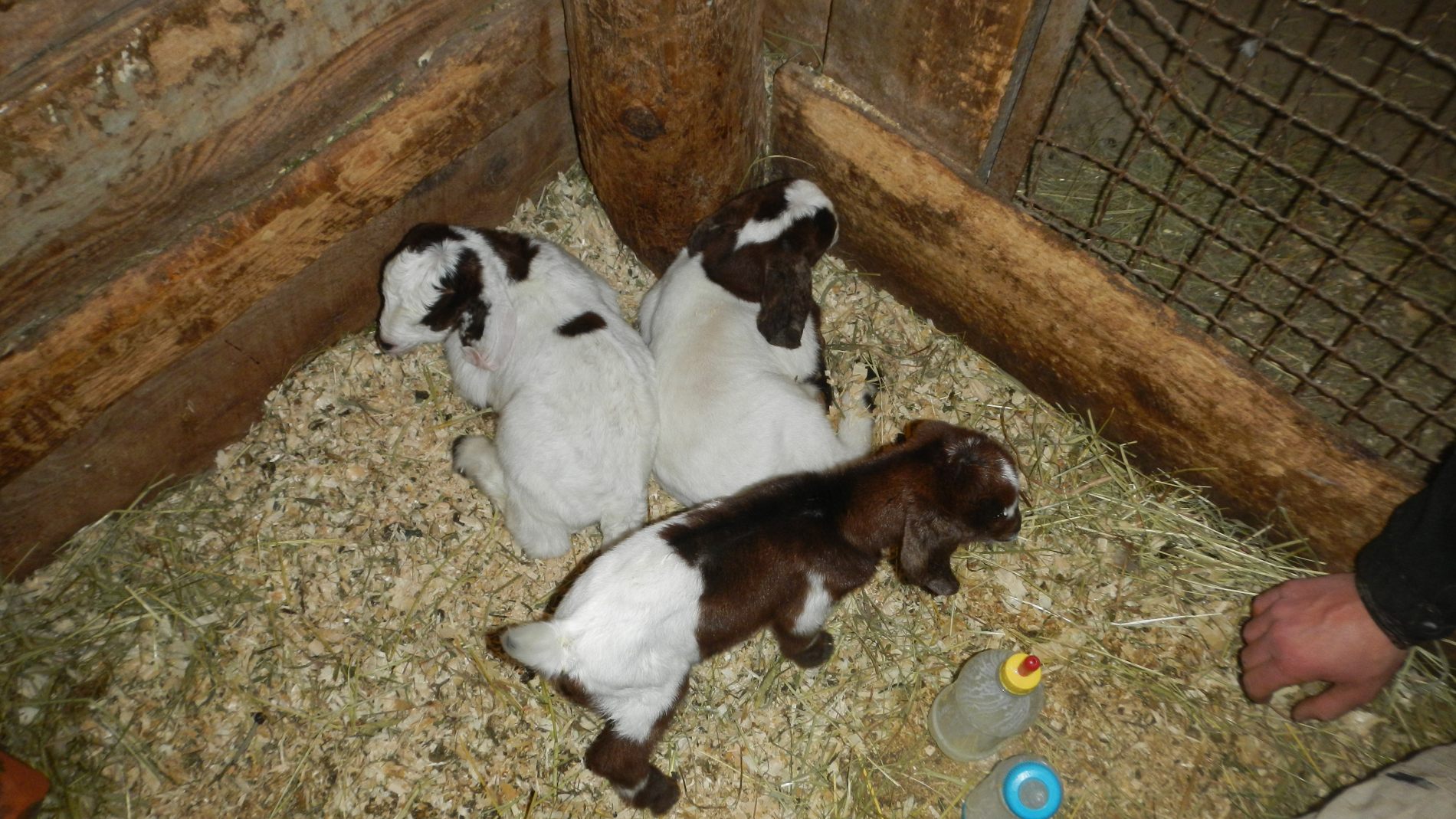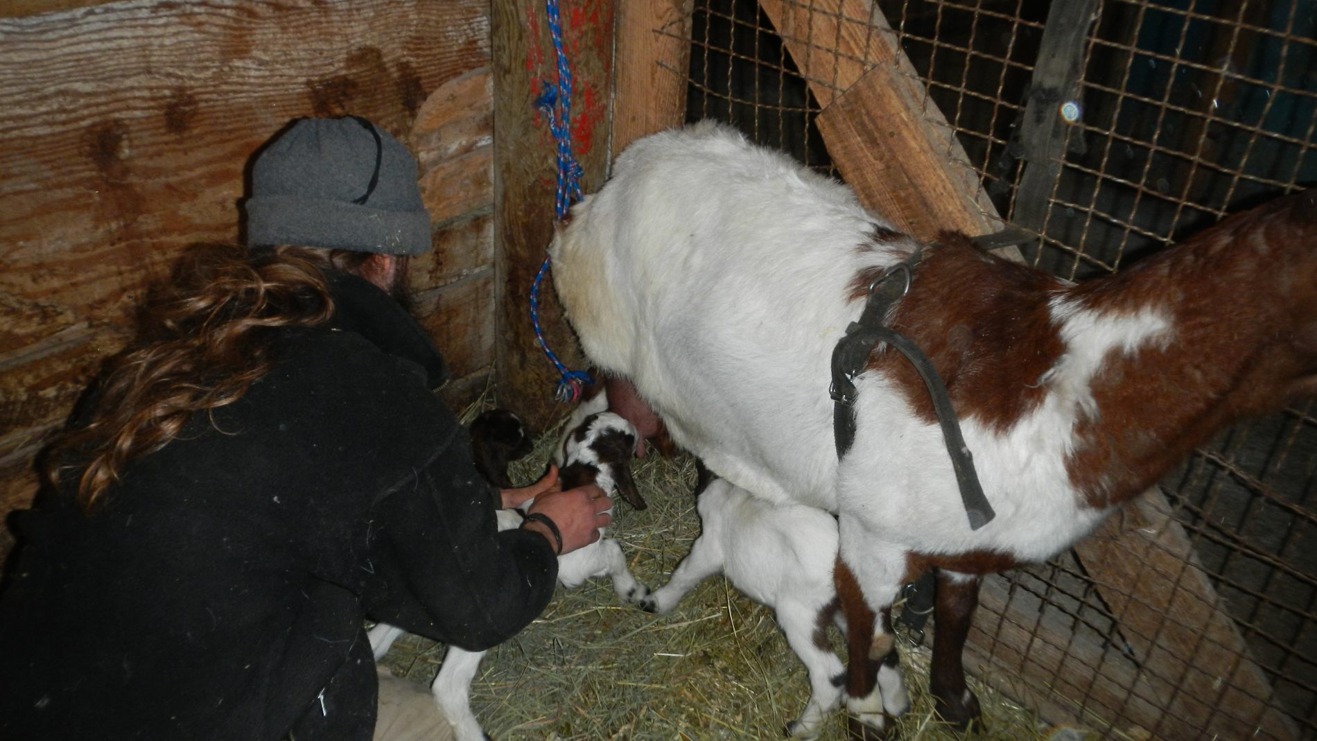 Deux jours plus tard, une deuxième donne naissance à 3 petits. Et c’est là que les jours vont se rallonger. Effectivement, elle ne laisse pas téter ses petits (il faut dire aussi qu’une chèvre n’a que 2 mamelons). On essaye de stimuler les petits, de calmer la mère, on sait combien le premier lait est important pour la croissance et les premiers apports nutritifs. Rien n’y fait 🙁 On se résout à attacher la mère et pousser les chevreaux vers les mamelons. Ca ne fonctionne toujours pas. Peut-être a t-elle trop de lait et que ça lui fait mal, alors on s’essaye à la traire. Julie semble plus douée que Jeremy 😉 Malgré ça elle ne les laisse toujours pas téter 🙁 Dernière solution, traire la chèvre et donner le lait en biberon aux 3 chevreaux. Ca peut avoir l’air simple comme ça, et bien on peut vous dire que ça ne l’est pas ! Entre attacher la chèvre, d’abord stimuler les petits qui s’affaiblissent, traire la mère, tenter de donner le biberon avec les petits qui braillent, ce qui nous prend à peu près une heure, et qui est à refaire toutes les 2 heures ! Dernière tournée à 23h et c’est reparti à 6h. Alors oui, c’est super mignon de se dire qu’on a donné le biberon à des chevreaux pendant 2 jours et qu’ils seraient peut-être morts sans notre intervention, mais c’est de l’énergie ! Imaginez notre joie quand 3 jours plus tard ils ont tété tout seuls pour la première fois. Je vous avoue qu’on avait notre petit chouchou, Tachu, qui venait téter la barbe de Jeremy pensant que c’était sa mère 😉