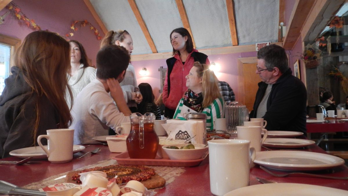 1h20 plus tard, car c’est pas loin, enfin tout est relatif 😉 on se retrouve avec le club de canoë kayak à la cabane à sucre « Au pied de l’érable » pour une succession de plats avec heuuu…. du sucre, avez vous dit du sucre ?