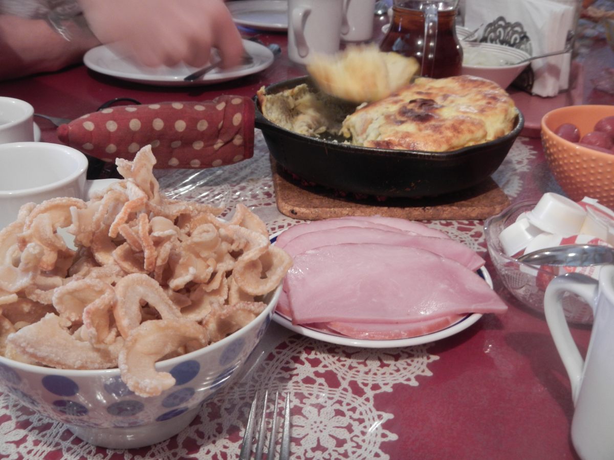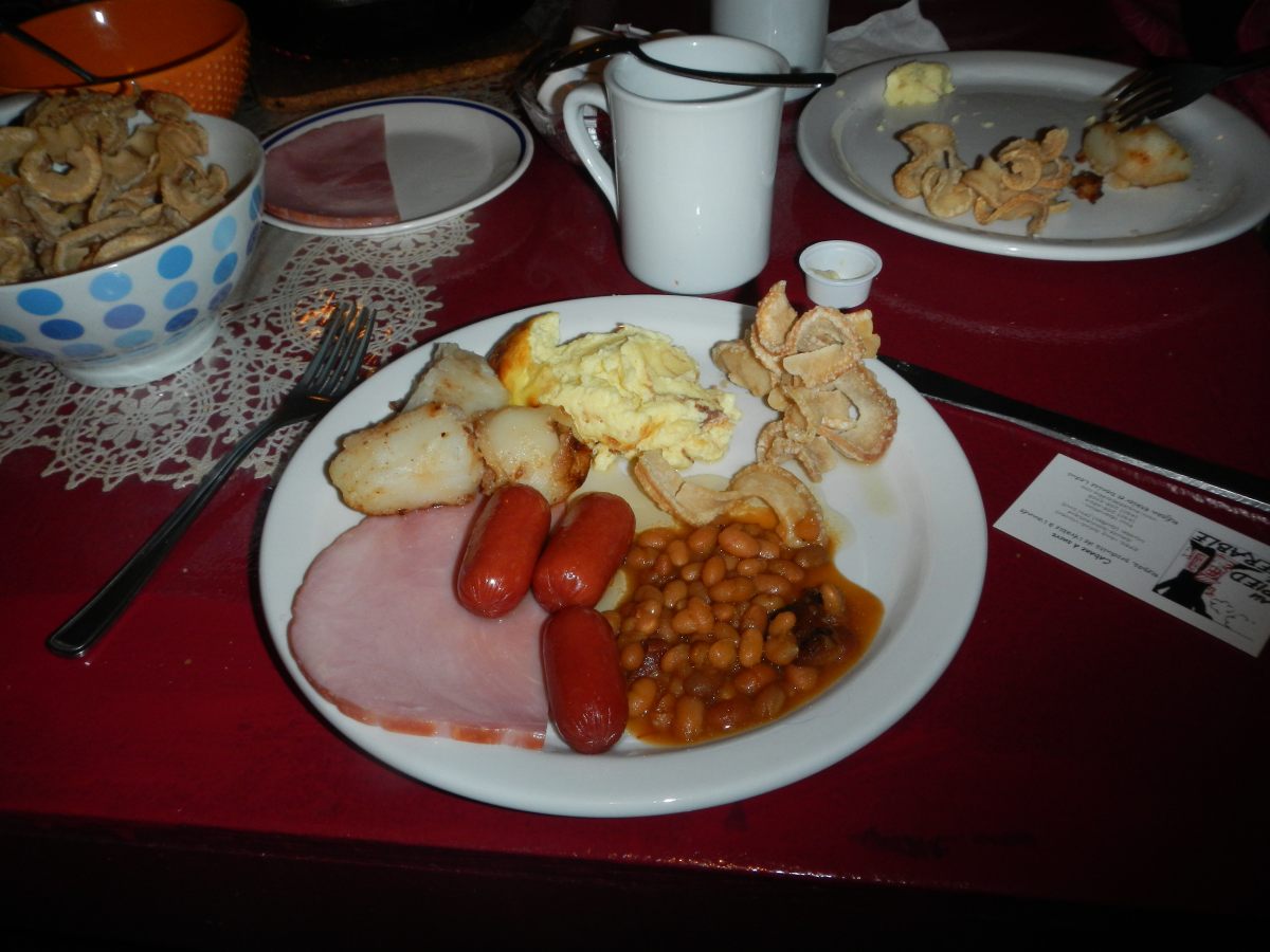 Le plat suivant devient intéressant, une assiette avec, à volonté : des beans en sauce (genre breakfast anglais pour ceux qui connaissent), des poootates légèrement rissolées, une tranche de jambon, et une omelette de 5 cm d’épaisseur ! et des oreille de crisse 😉 le tout baignant dans le sirop d’érable pour les vrais, mais arrosé de sirop c’est déjà bien pour nous. Parce qu’apparemment d’après Louis-Philippe on arrosera encore quelques fois notre foie de sirop 😉 C’est vraiment bon, mais pas parce qu’il y a du sucre partout mais le mélange est inhabituel et intéressant. Il y a des mélanges meilleurs que d’autres car les beans avec le sirop n’étais pas à refaire absolument, par contre l’omelette et le sirop a particulièrement retenus notre attention. Et ce qui a retenus mon attention ce sont les oreilles de crisse. Alors ça! ça c’est vraiment bon ! Pour vous résumer la chose, d’après un Québequois « c’est du gras cuit dans du gras » ce sont des tranches de lard cuites à la friteuse, c’est tellement cuit qu’elles se tordent donc en forme d’oreille, et paraitrait-il qu’il y a très longtemps ça devait être celle du Christ. Ca c’était pour la petite histoire des oreilles de crisse 😉 Ça ressemble à des chips, et je n’arrive plus à arrêter d’en manger 😉