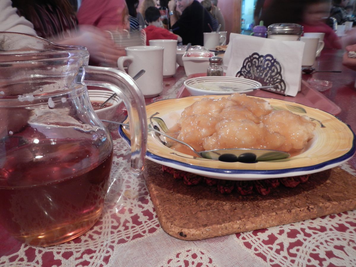 Des petites crêpes, certaines au sarrasin, avec vous savez quoi maintenant 😉 Et les fameux « grand-père dans le sirop ». Comment décrire ça … on aurait jamais trouvé tout seul, alors on demande à un canadien. Ce sont donc des boules d’une sorte de pâte à gâteau cuites dans le sirop. Encore du sucre dans du sucre ? nonnn 😉