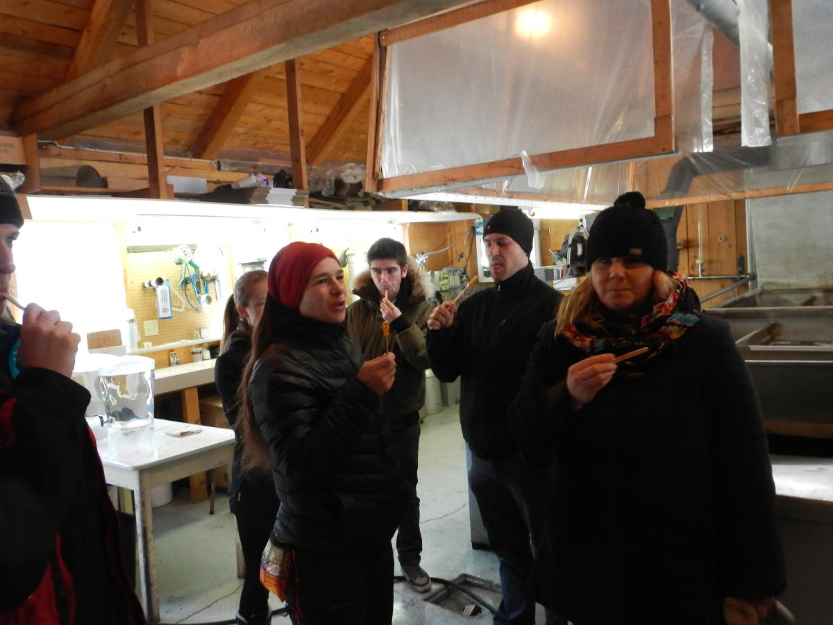 Le principe ? C’est assez simple, encore du sucre 😉 Bon, pour être plus précis, c’est un vieux canadien, un peu rustre, un peu bucheron, qui verse une louche de sirop de tire à l’érable sur la neige, ce qui le fige, le sirop, pas le monsieur, et donne une consistance caramel. Avec un bâtonnet qu’on nous donne, les connaisseurs comme Louis-Philippe confectionnent eux-même leur palette en bois, on ramasse le sirop en l’enroulant autour du bâtonnet, ça donne une sorte de sucette. On ne se débrouille pas si mal pour des belges 😉