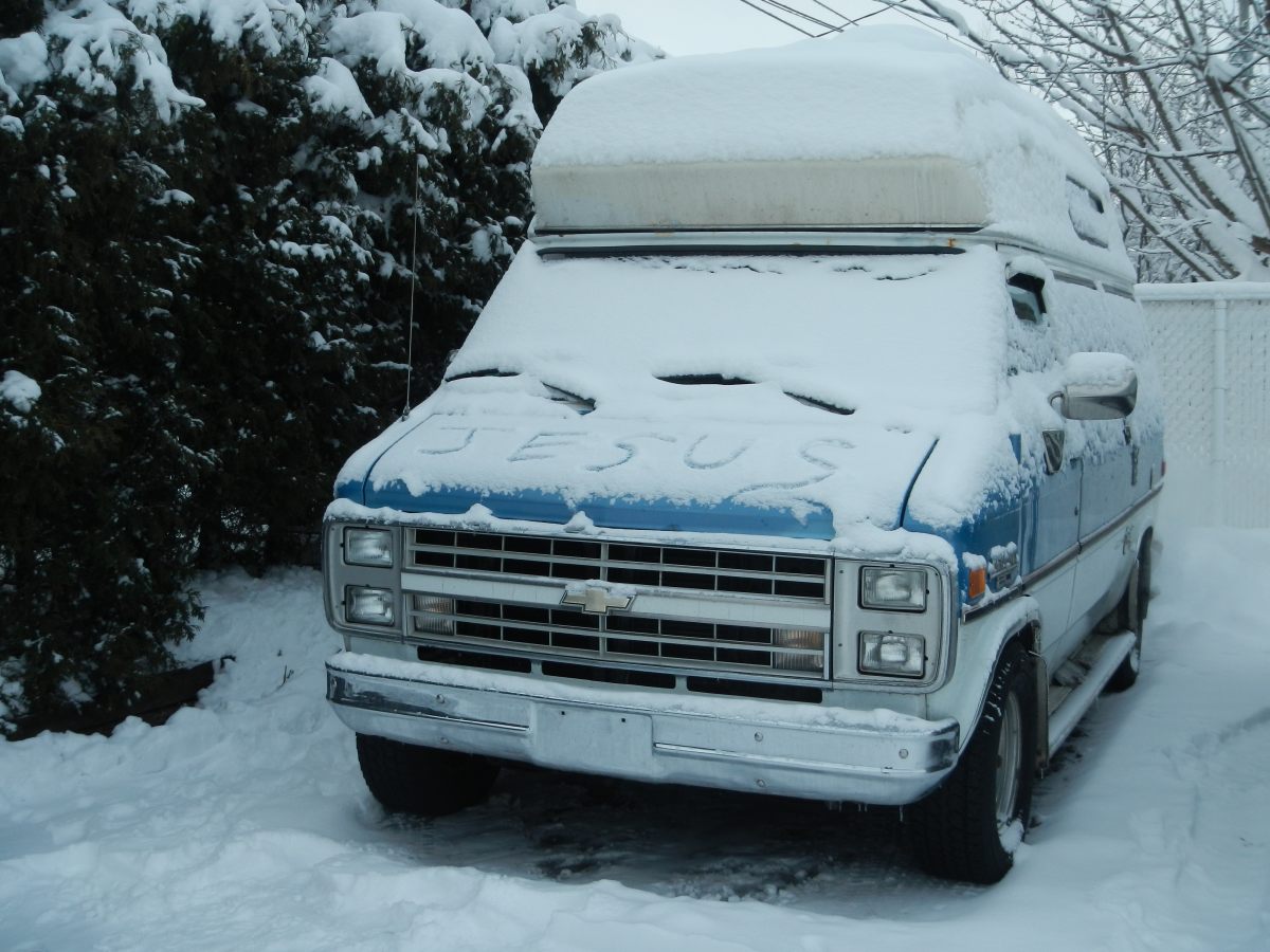 C’est un Chevrolet Chevy van G20 ou GV on a jamais compris à cause de la prononciation québecoise 😉 de 1987 cylindrée 5.0 L, et ça fait un bruit TERRIBLE c’est génial, ça ronronne qu’aux oreilles de Jeremy ;-), poids 2350 kg, normalement 15L/100km gourmand la bête 😉 260.104 km au compteur et 2 fous au volant 😉