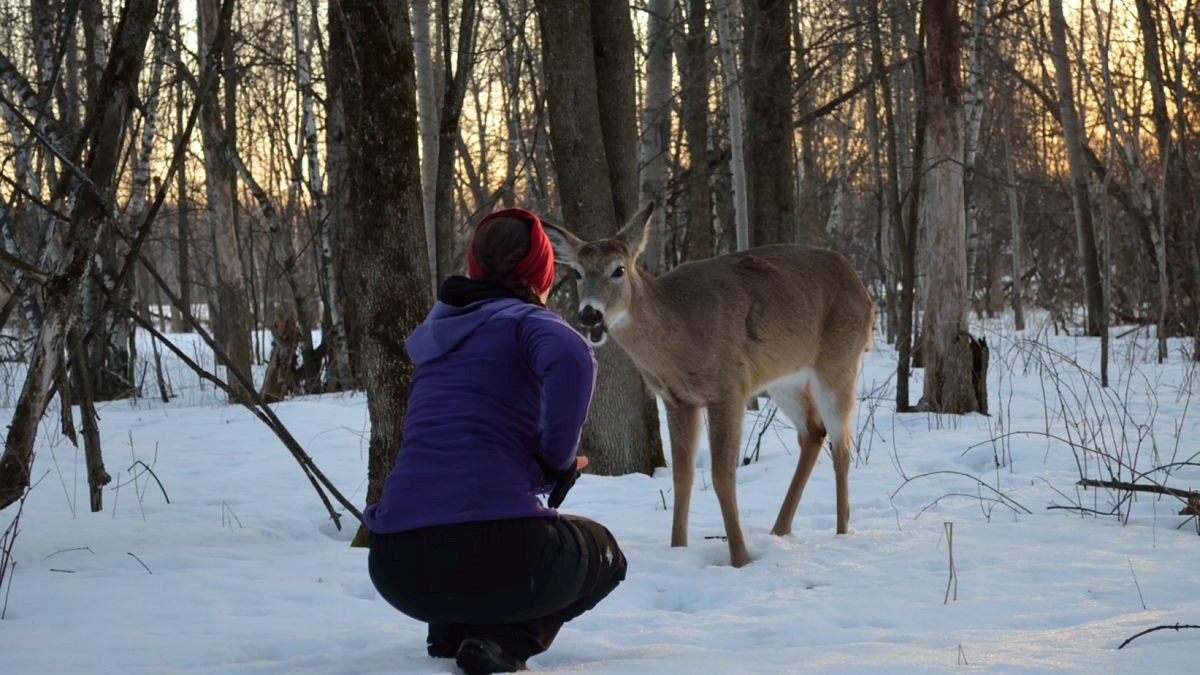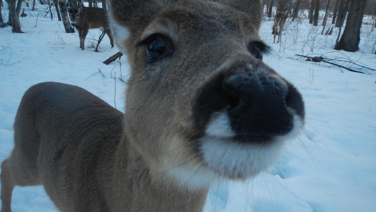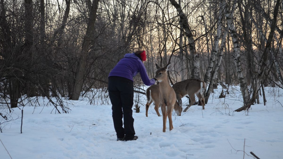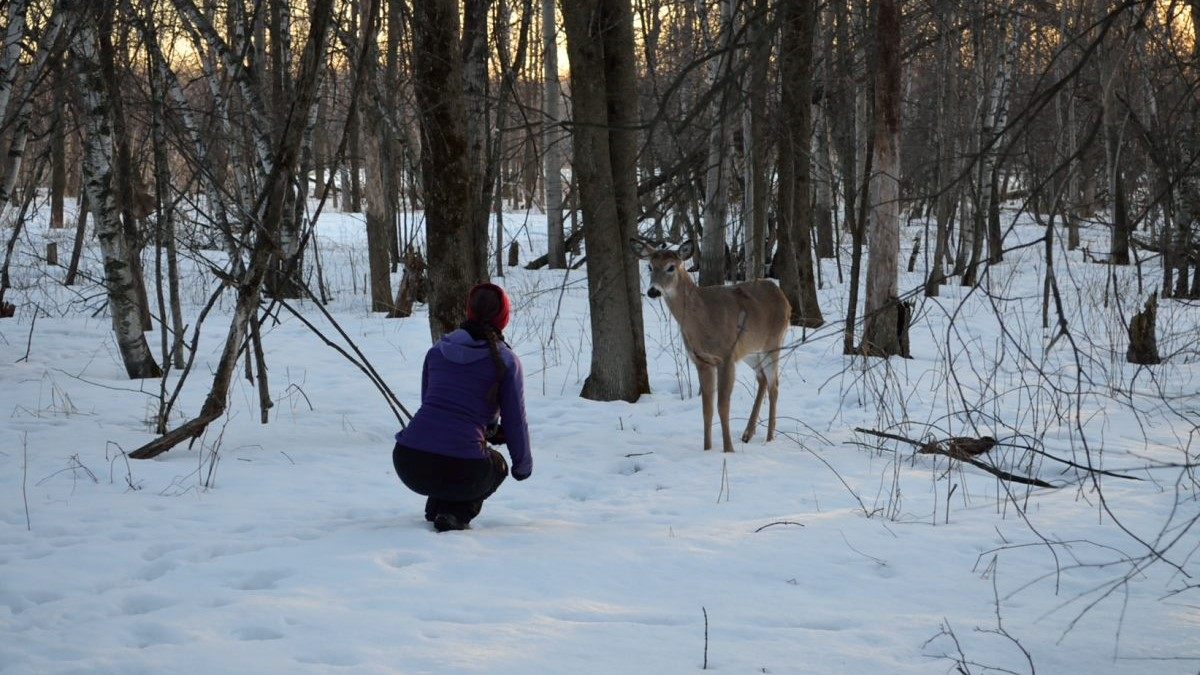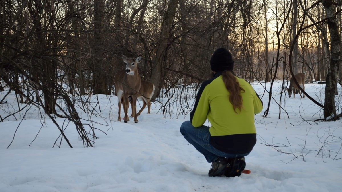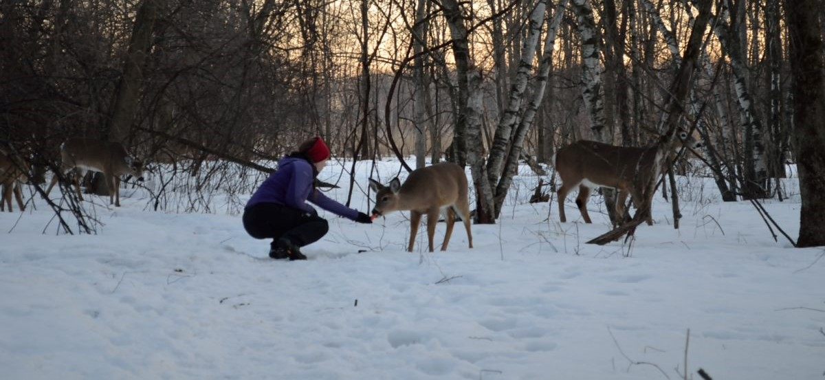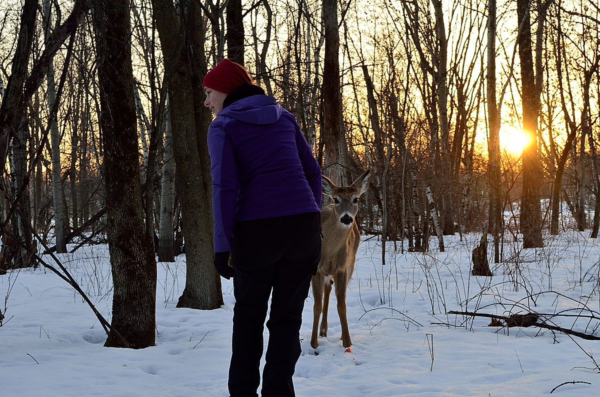 Juste avant la tombée du jour, nous allons dans le parc de Longueuil, gratuit et quasi désertique cette fois, pour espérer apercevoir des chevreuils, dans cet endroit ou ils sont en liberté et protégés. Cela a dépassé toutes nos attentes, un des 10 qu’on a pu approcher est même venu manger dans ma main 🙂 Et visiblement, il n’y a pas que les carottes qui les attirent, mais aussi les appareils photos orange 😉