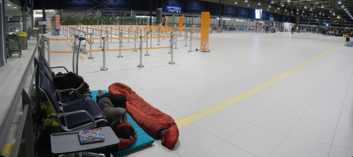 Mais avant ça, un petit dodo … nous trouvons donc un Bed and Breakfast devant la porte d’embarquement (effectivement un lit Break et Fast) et comme repas au souper c’est tartine au choco sur siège d’aéroport. Et on ne mangera que ça pendant 15h 😉