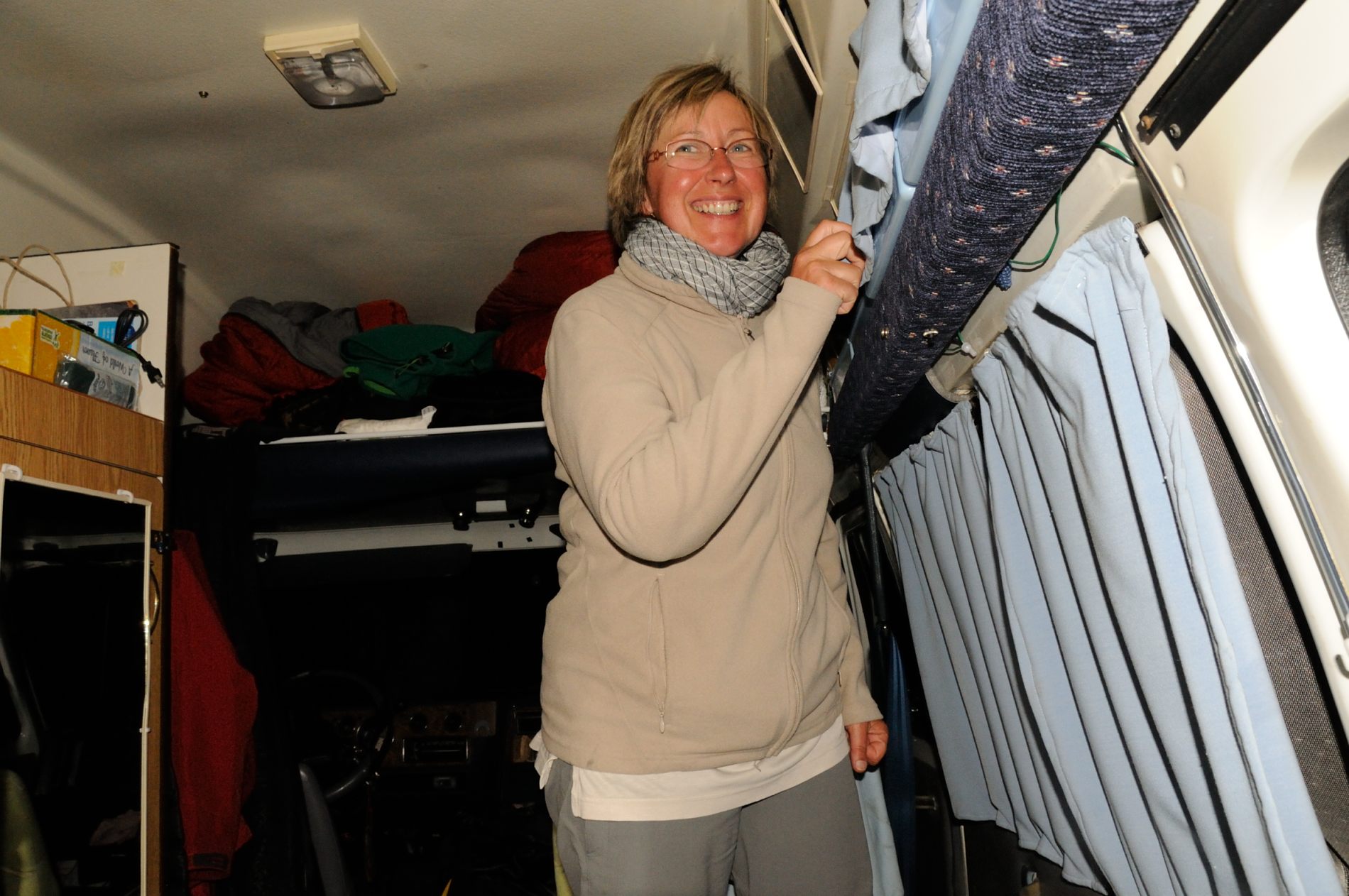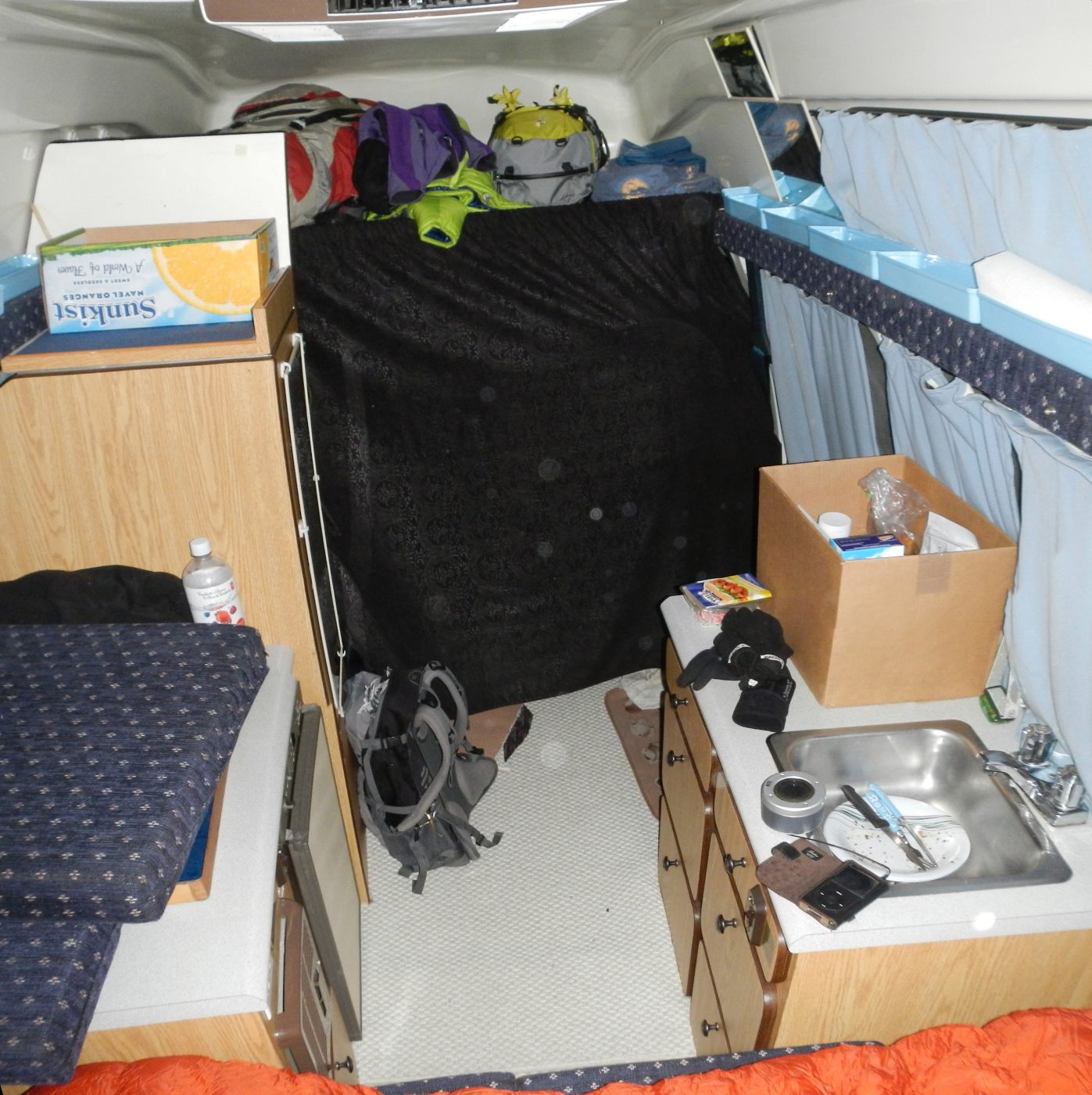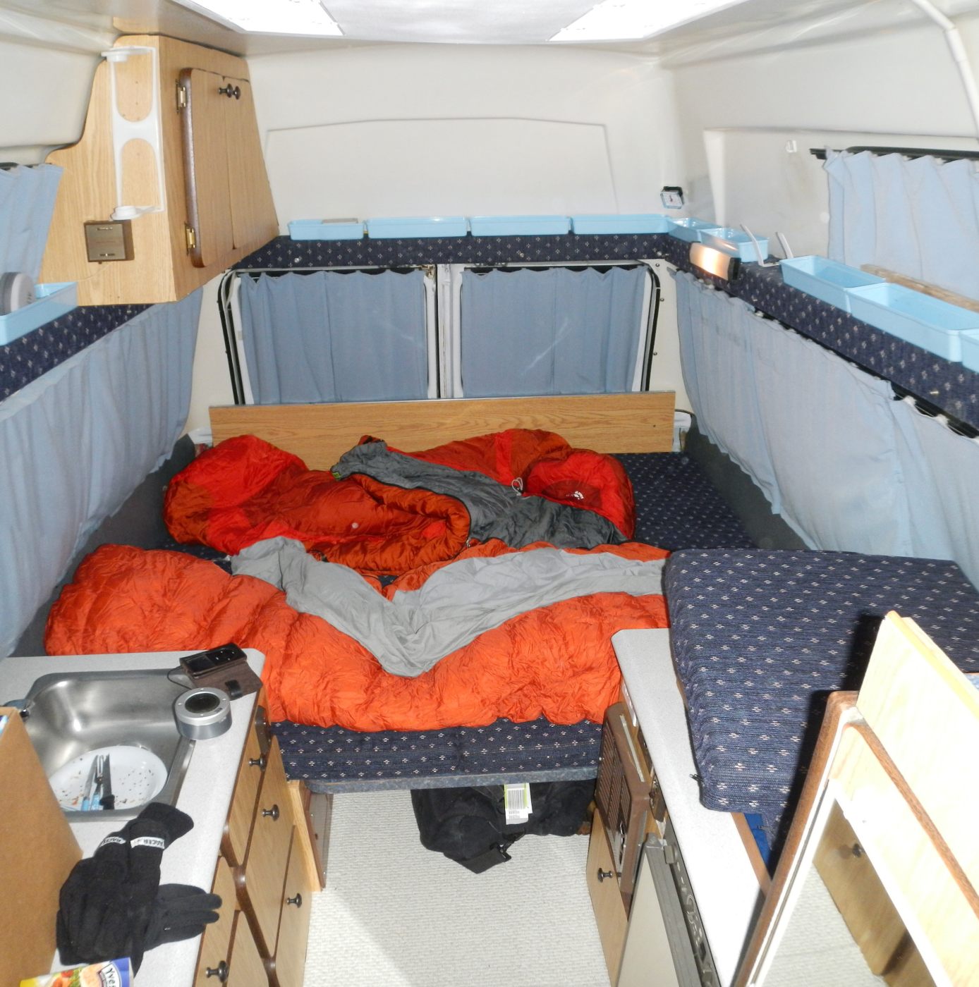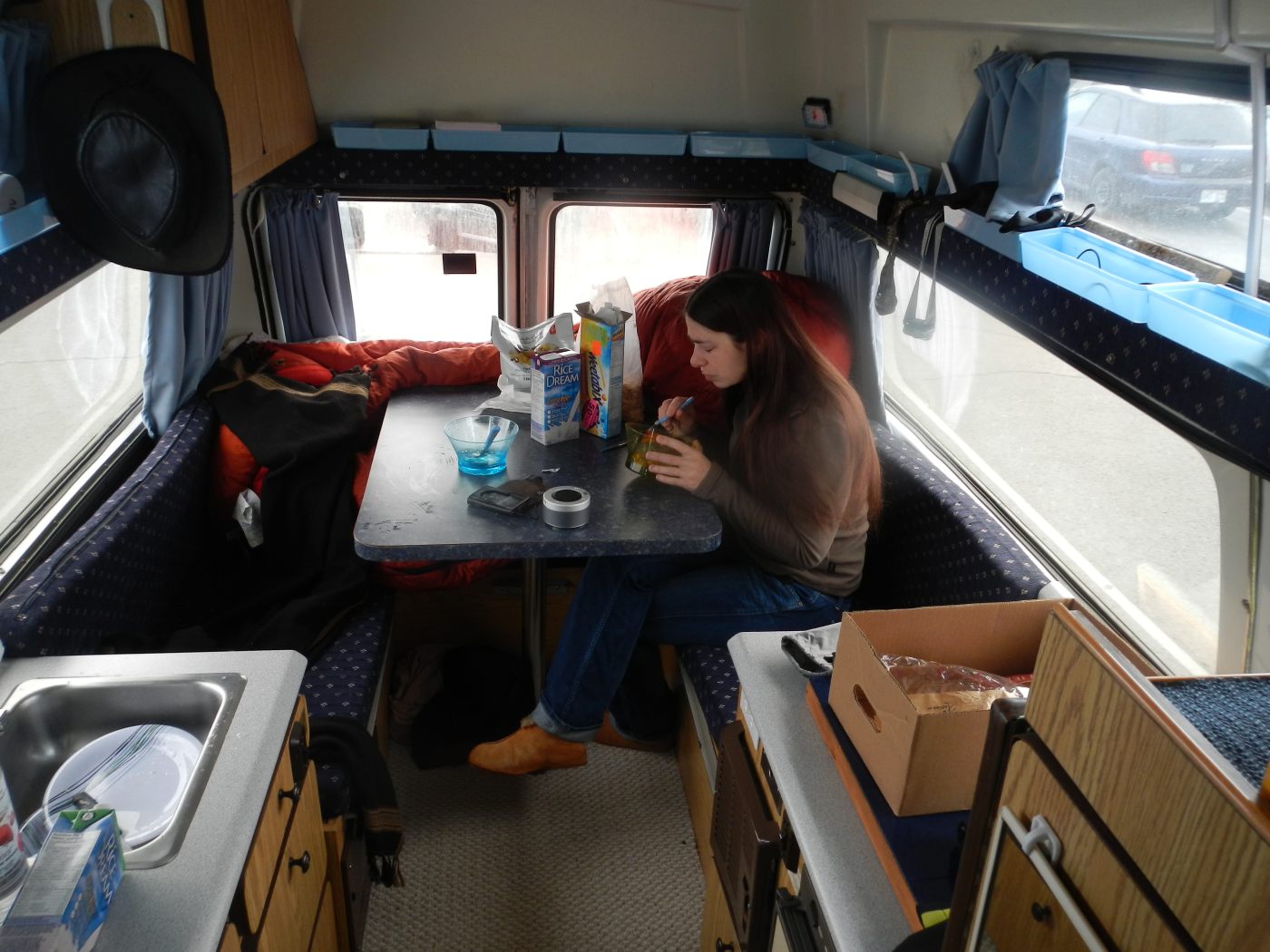 Alors, ce camper … la première nuit … Pour ce qui est du confort, j’ai l’impression d’être en mode camping, encore à améliorer pour les nombreuses prochaines nuits. Jeremy se sent un peu à l’étroit et à rajouter à ça que la nuit par -4° et un sac de couchage vraiment pas top, il a eu froid 🙁