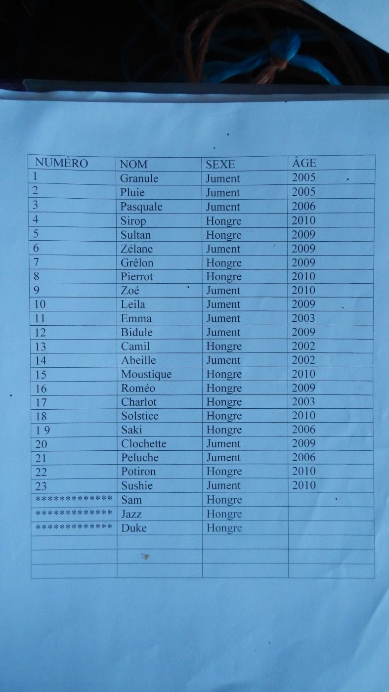 Au revoir tous les animaux, Chocolate, Amande, Henri, Zara, Doudou, Cannelle, Ulysse, Mistigri, Ombre, Pivoine et les autres, les ânes, les moutons, les agneaux, les chèvres, les chevreaux, les poules, les poussins, les lapins, les canetons, les paons, les chevaux, on ne va pas tous les citer, sauf Zoé, qu’on reverra bientôt, merci à tous de nous avoir appris à s’occuper de vous.