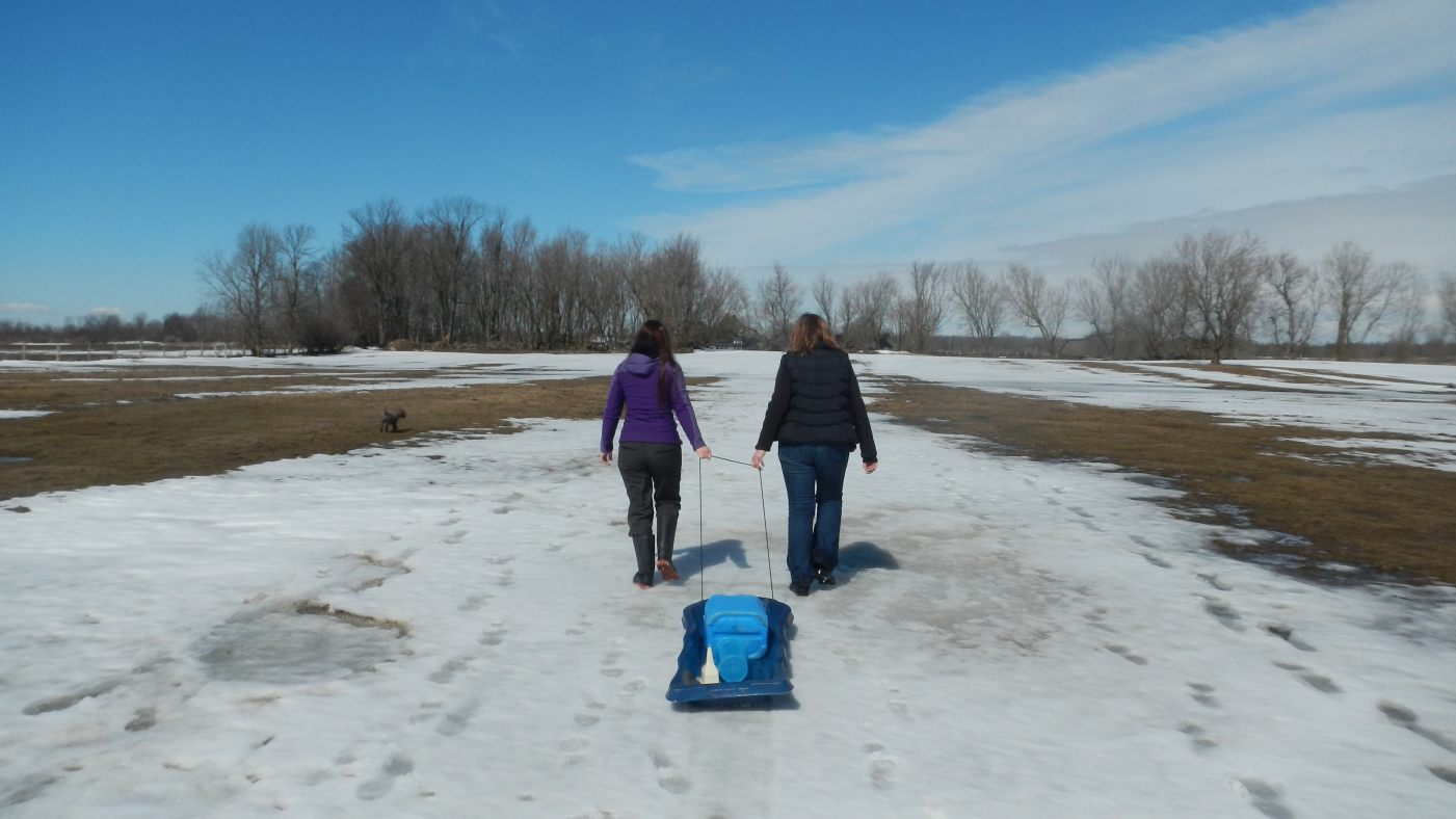 Après ça, le bide plein de sucre et le sang qui sature, une petite balade dans la neige s’impose. Pendant que certains montent dans une calèche tirée par un tracteur, bonjour le charme 🙁 on préfère marcher et tenter de digérer un peu, bien qu’on commence à sentir le mal de ventre venir… Il fait beau, mais il fait froid.