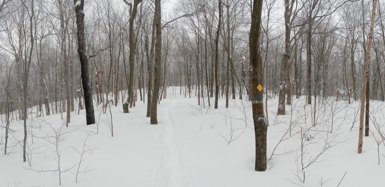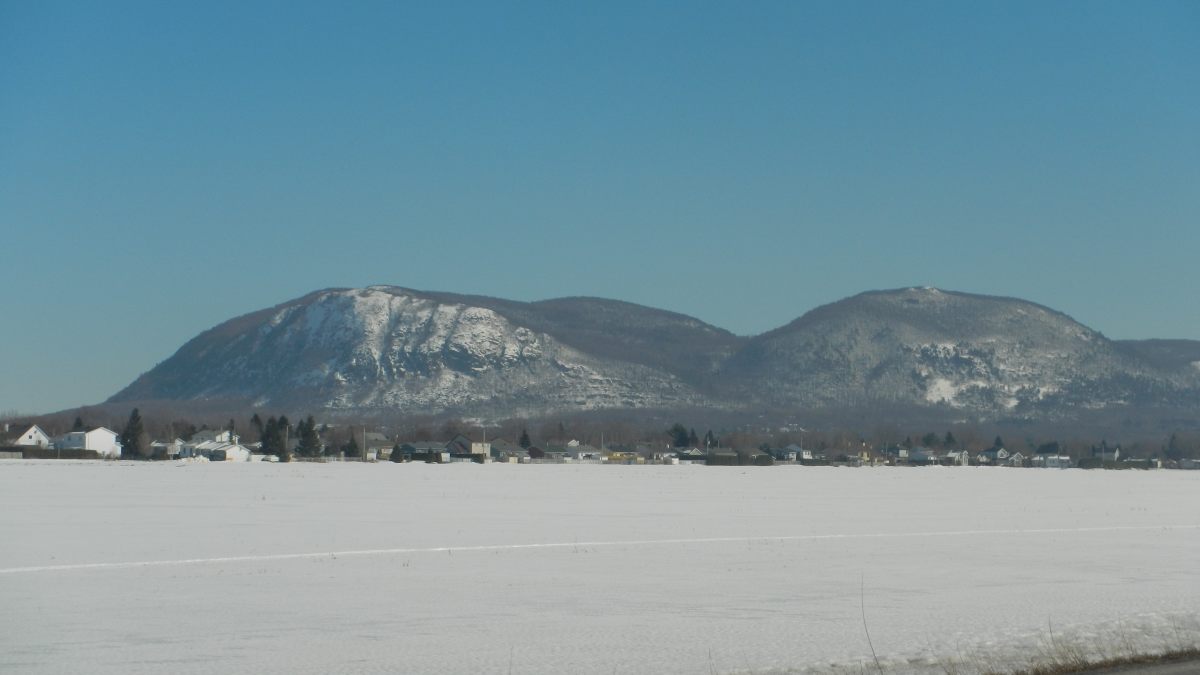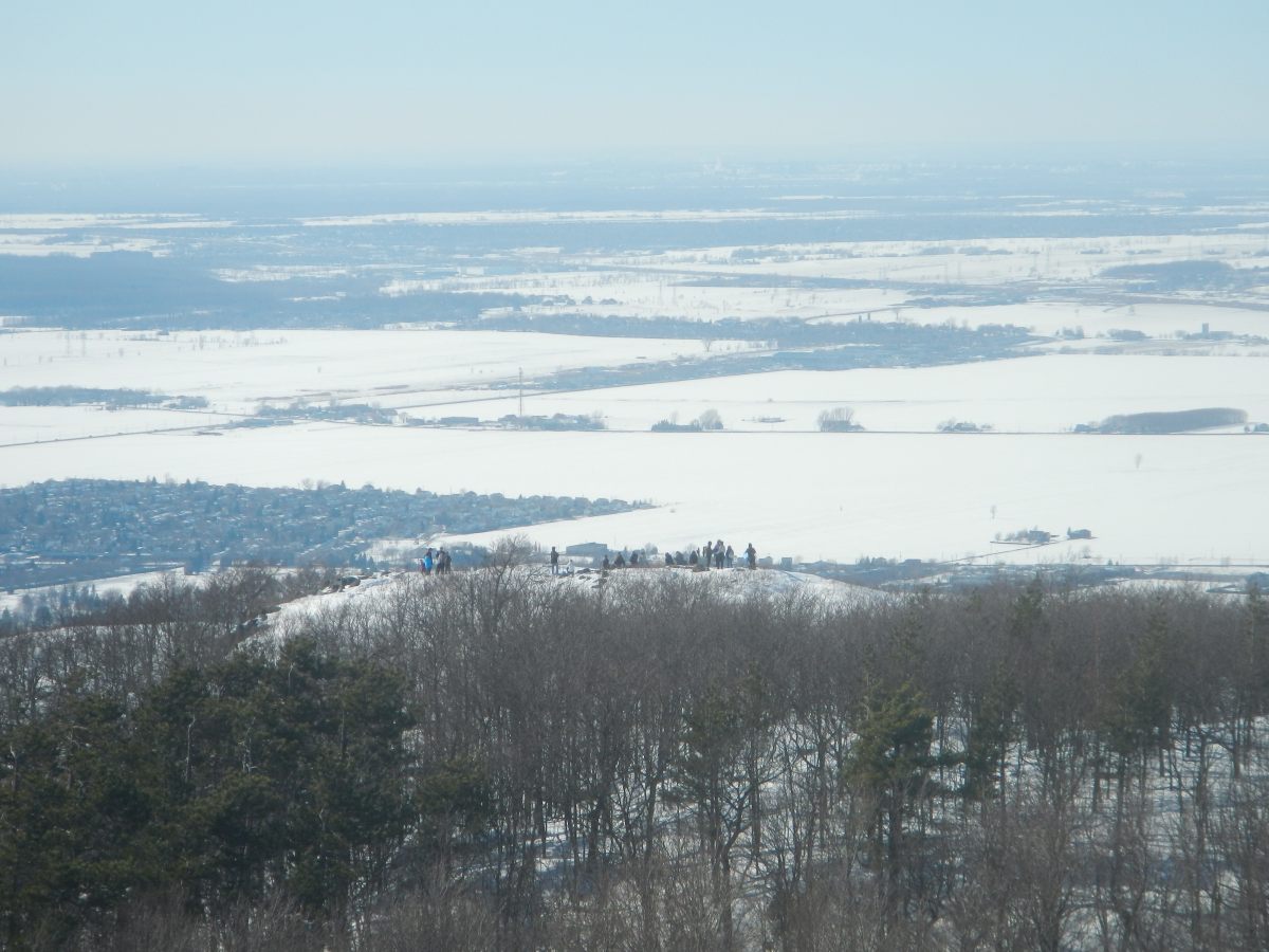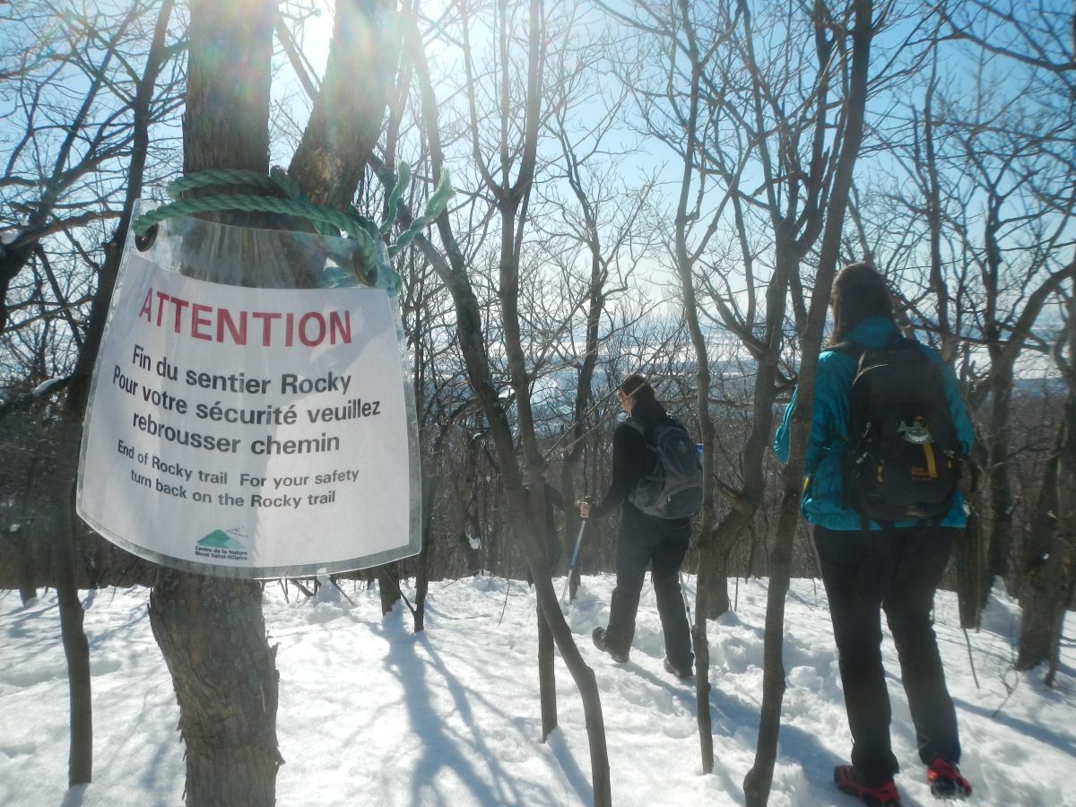 En commençant par le Mont Saint-Hilaire, à 1h de Montréal, un coin de nature malheureusement fort fréquenté par les citadins montréalais, mais on les comprend car c’est une réserve naturelle qui n’a jamais été exploitée par l’homme. Ce site appartenait à un riche propriétaire qui en a fait don à l’université qui en a fait un centre de recherche grandeur nature et de préservation. A l’entrée un panneau indique 6 dollards pour pénétrer dans le parc, dont le parking est complet. Un autre panneau indique aussi l’état des sentiers : « glace ». Effectivement après quelques mètres certains chaussent des mini crampons, je ne peux m’empêcher d’éclater de rire 🙂