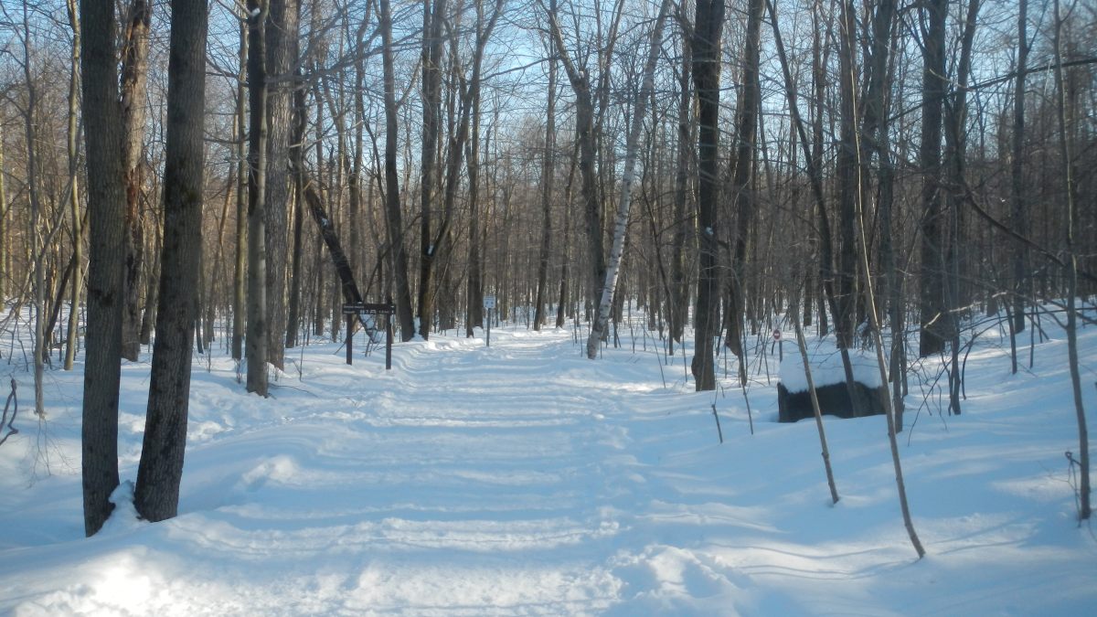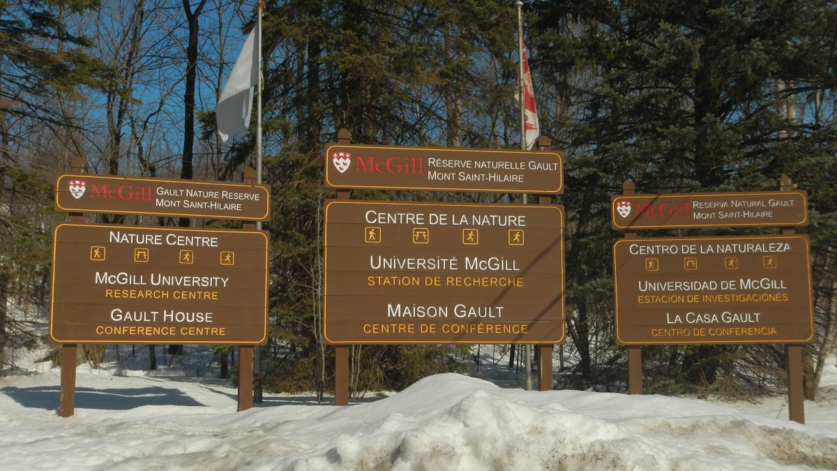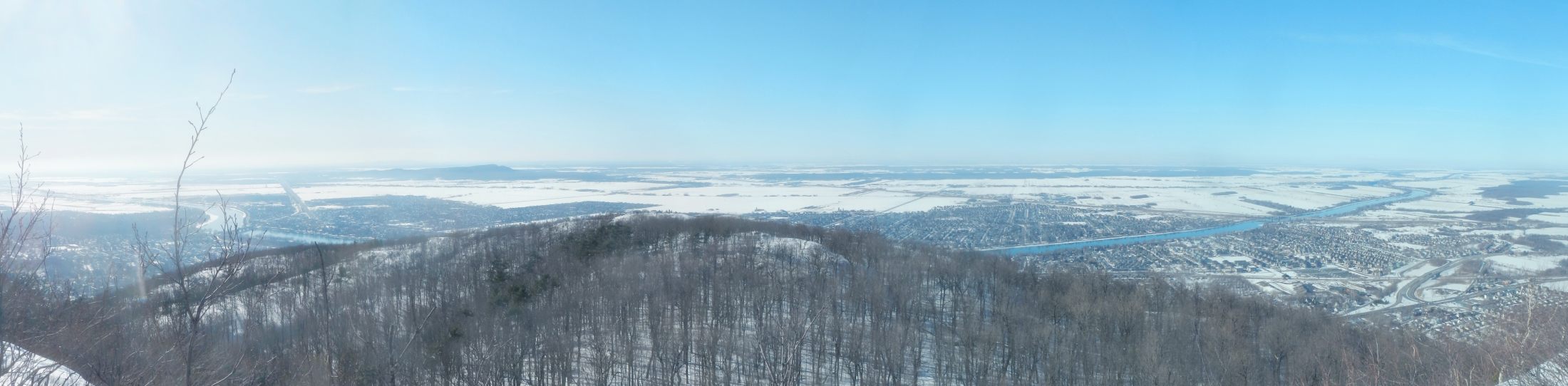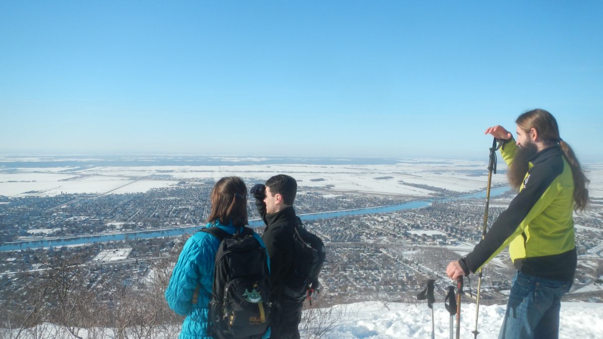 En commençant par le Mont Saint-Hilaire, à 1h de Montréal, un coin de nature malheureusement fort fréquenté par les citadins montréalais, mais on les comprend car c’est une réserve naturelle qui n’a jamais été exploitée par l’homme. Ce site appartenait à un riche propriétaire qui en a fait don à l’université qui en a fait un centre de recherche grandeur nature et de préservation. A l’entrée un panneau indique 6 dollards pour pénétrer dans le parc, dont le parking est complet. Un autre panneau indique aussi l’état des sentiers : « glace ». Effectivement après quelques mètres certains chaussent des mini crampons, je ne peux m’empêcher d’éclater de rire 🙂