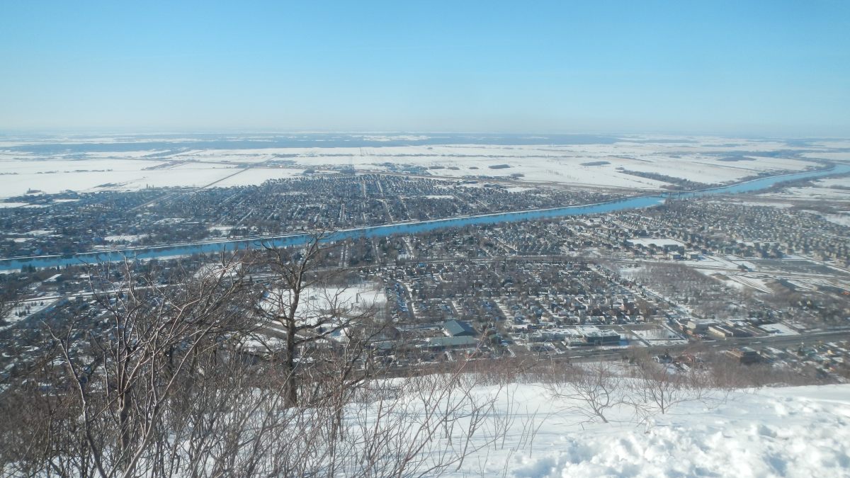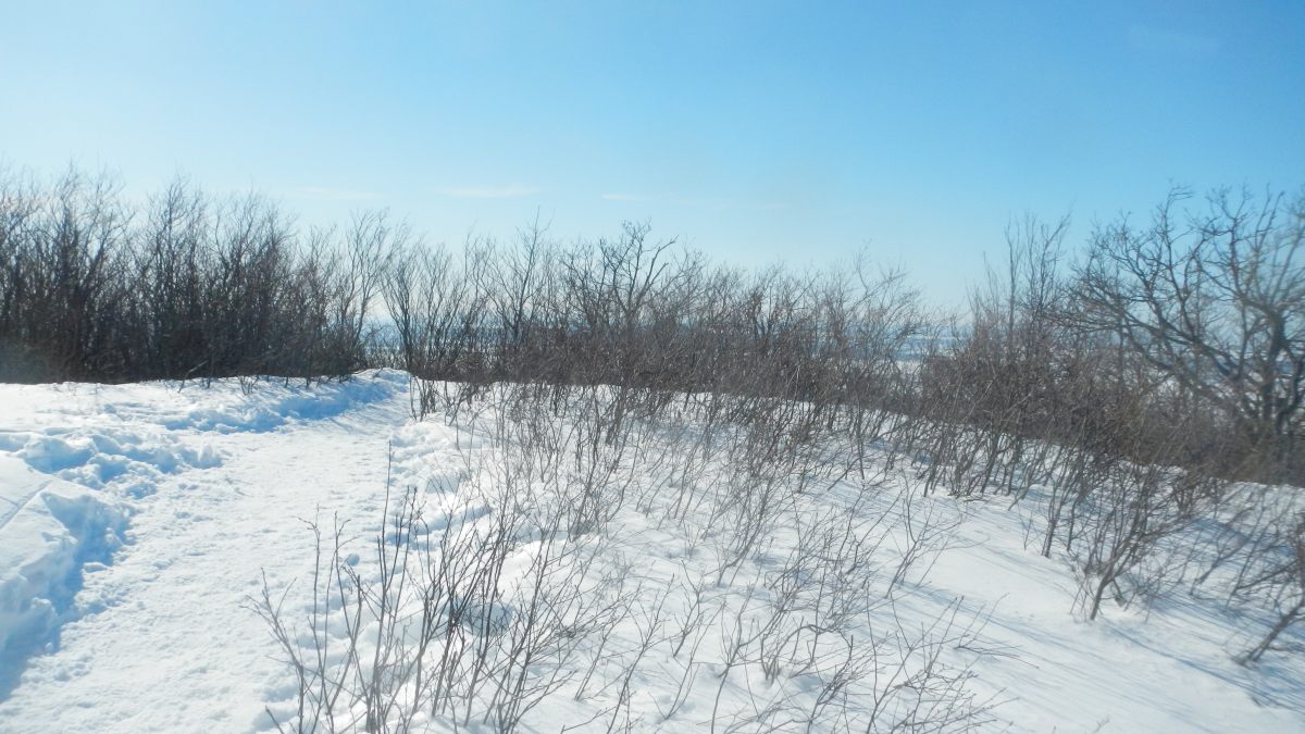1h15 plus tard, on arrive au sommet à 415 m, ou 1358 pieds pour les québecois, et effectivement, cet endroit, c’est le pied ! Devant nous s’étend une plaine plus plate que notre pays à perte de vue, avec la neige, c’est magnifique. On aperçoit le sommet d’en face en contre-bas, qu’on va rejoindre par un sentier pas tout à fait officiel 😉 (voir photo) On entame ensuite une descente direction une source d’eau potable, bien froide.