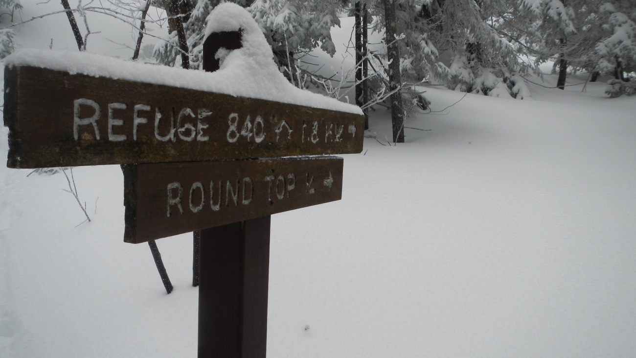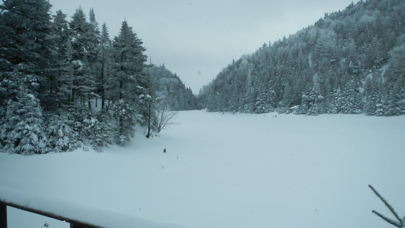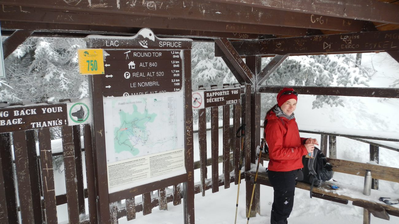 S’en vient à 750m le temps de découvrir le lac bordé de sapins ployant sous une neige immaculée posée, délicate et légère. Le lac, une grande surface blanche et lisse. Mais comme nous le disait Louis-Philippe, on ne fait pas la différence entre un lac et une prairie quand c’est recouvert de neige. Alors après avoir quand même profité de la vue et d’une tasse de thé bien chaud, on continue sur des chemins plus escarpés pour rejoindre le Round top et sa vue imprenable.