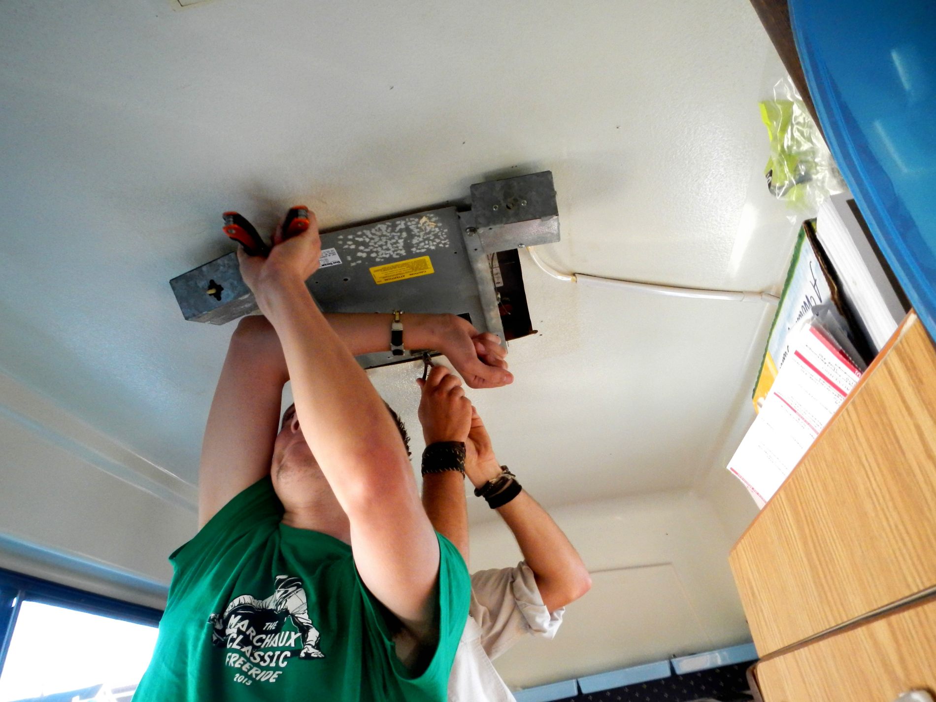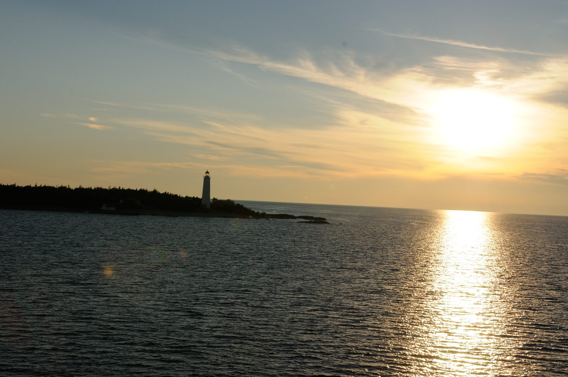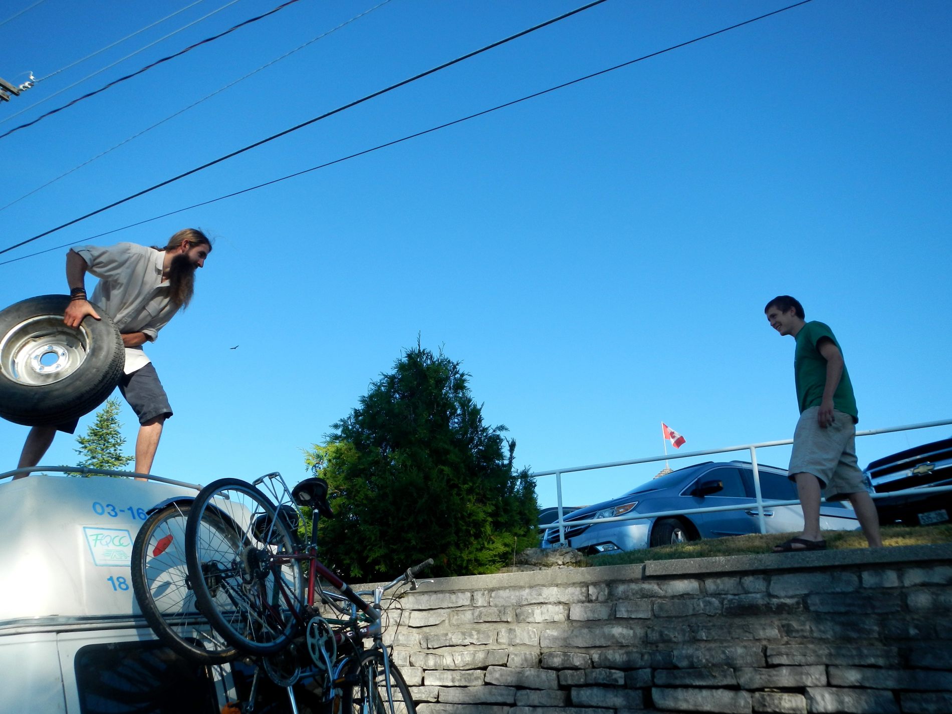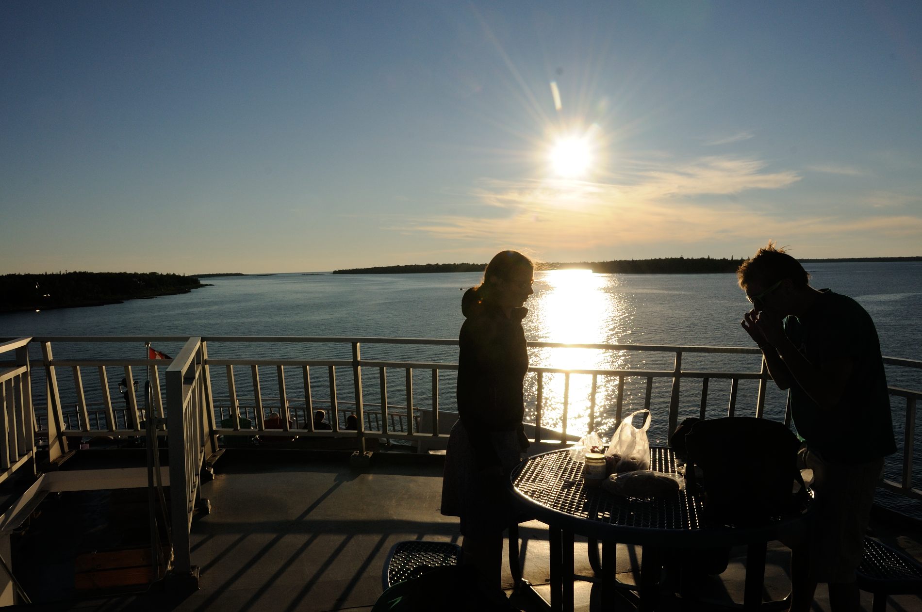 On arrive enfin au bout de la route de la péninsule, à Tobermory on se dirige vers le dernier ferry de la journée, pour South Baymouth sur l’île de Manitoulin. Manitoulin est la plus grande île au monde qui se trouve sur un lac, et il y a aussi des lacs sur l’ile. On passe pour s’enregistrer 2 heures avant le départ, et le prix annoncé n’est pas le même que celui qu’on a calculé, mauvaise surprise 🙁 notre campeur, vu sa hauteur passe dans la catégorie au-dessus. On sait que sur le toit ce qu’il dépasse c’est une roue de secours, pas difficile de la mettre à l’intérieur, mais il y a aussi la clim’. Jeremy est décidé à la démonter ! Par prudence, on demande quand même au gars si ça passerait sans ça. Le gars, super fat, dernier ferry, dernière minutes de son service, autant dire qu’il vient nonchalamment nous dire que ça passerait, mais que ça se démonte pas. Soit, Jeremy est focalisé sur le démontage, et c’est parti, on s’active tous les 3 et étonnamment on finit par y arriver 🙂 du coup, on a trou dans le toit 😉 bon, on croise les doigts pour qu’il ne pleuve pas 😉
