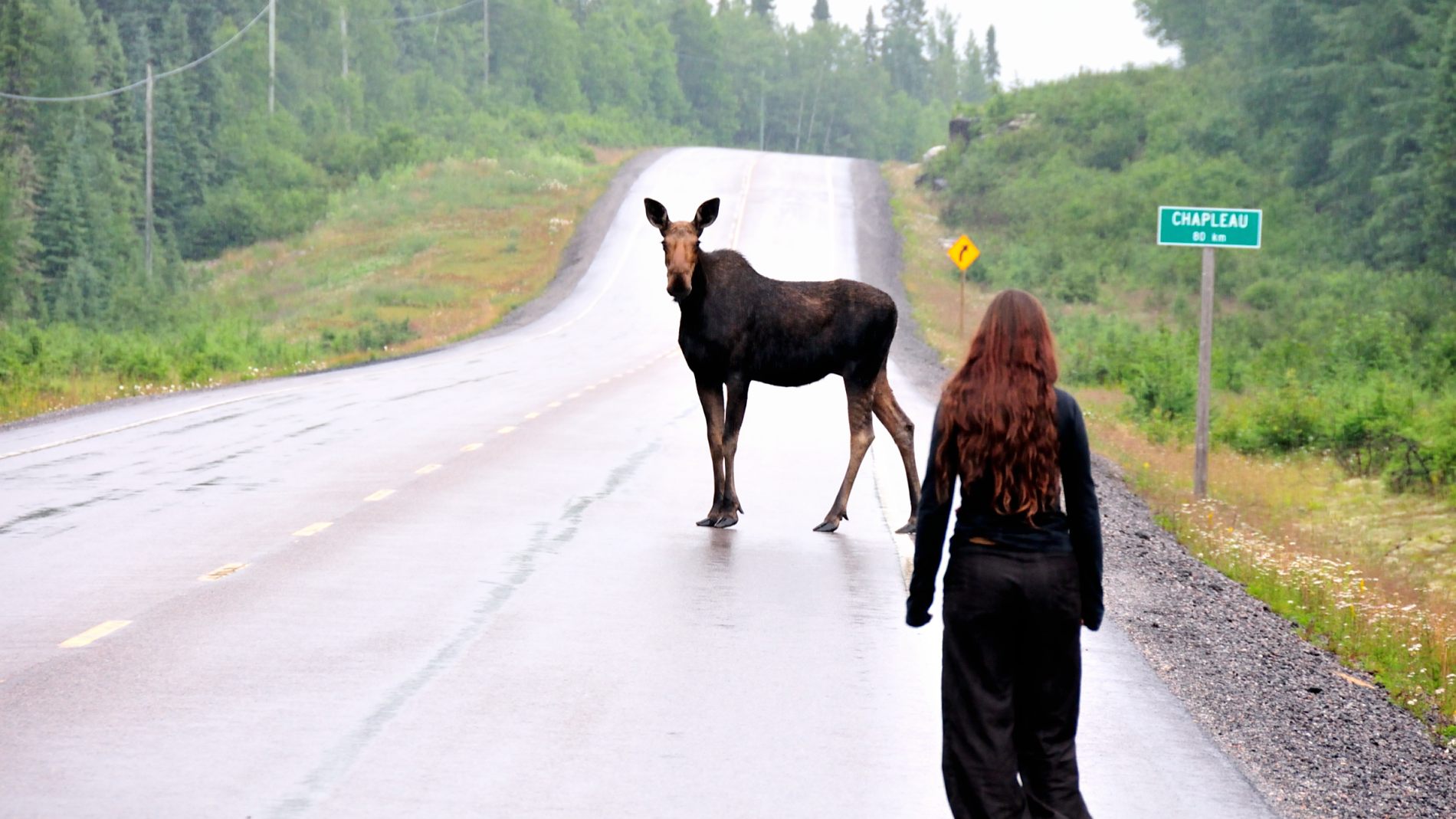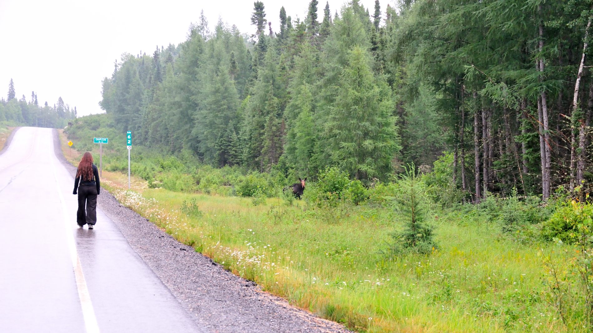 Une journée de route quasi non stop nous attend pour rejoindre Marathon. Mais pas sans intérêt cette journée. Alors que c’est Julie qui conduit, elle voit furtivement, à quelques mètres de la route, un orignal !!! 🙂 Je ralentis et dis à tout le monde dans la voiture qu’il y a un orignal au bord de la route. Jeremy, ni une ni deux, saute de son siège, prend ma place et fait demi tour, il s’arrête à quelques dizaines de mètres. L’orignal est toujours là, je saute de la voiture et m’approche doucement, il nous regarde tranquillement. Je continue à m’approcher doucement, il a l’air grand. Il monte sur la route, me fait face et fait un pas vers moi, c’est là que je me rends compte qu’il est vraiment grand ! Il continue de traverser la route, je fais de même, et après un dernier regard, il s’en va. Waw, trop génial ! 🙂