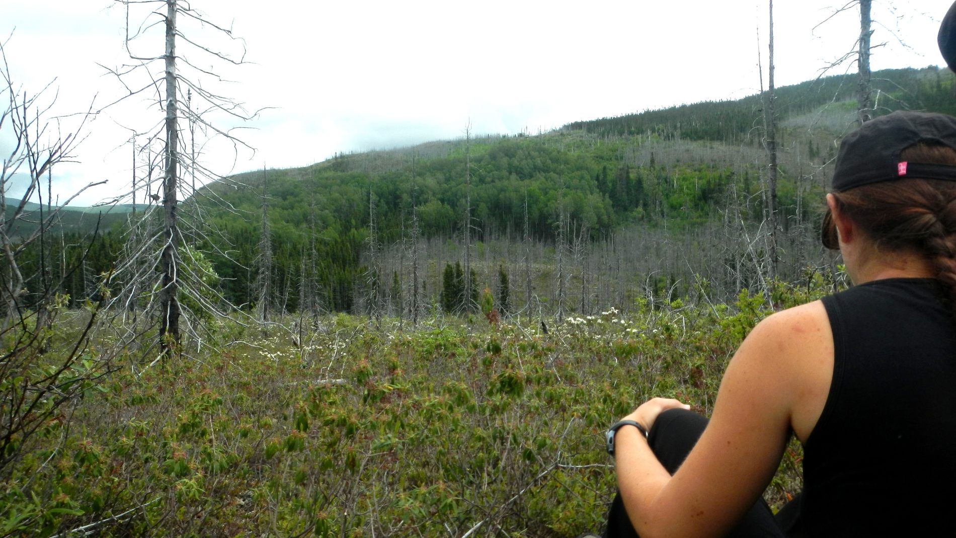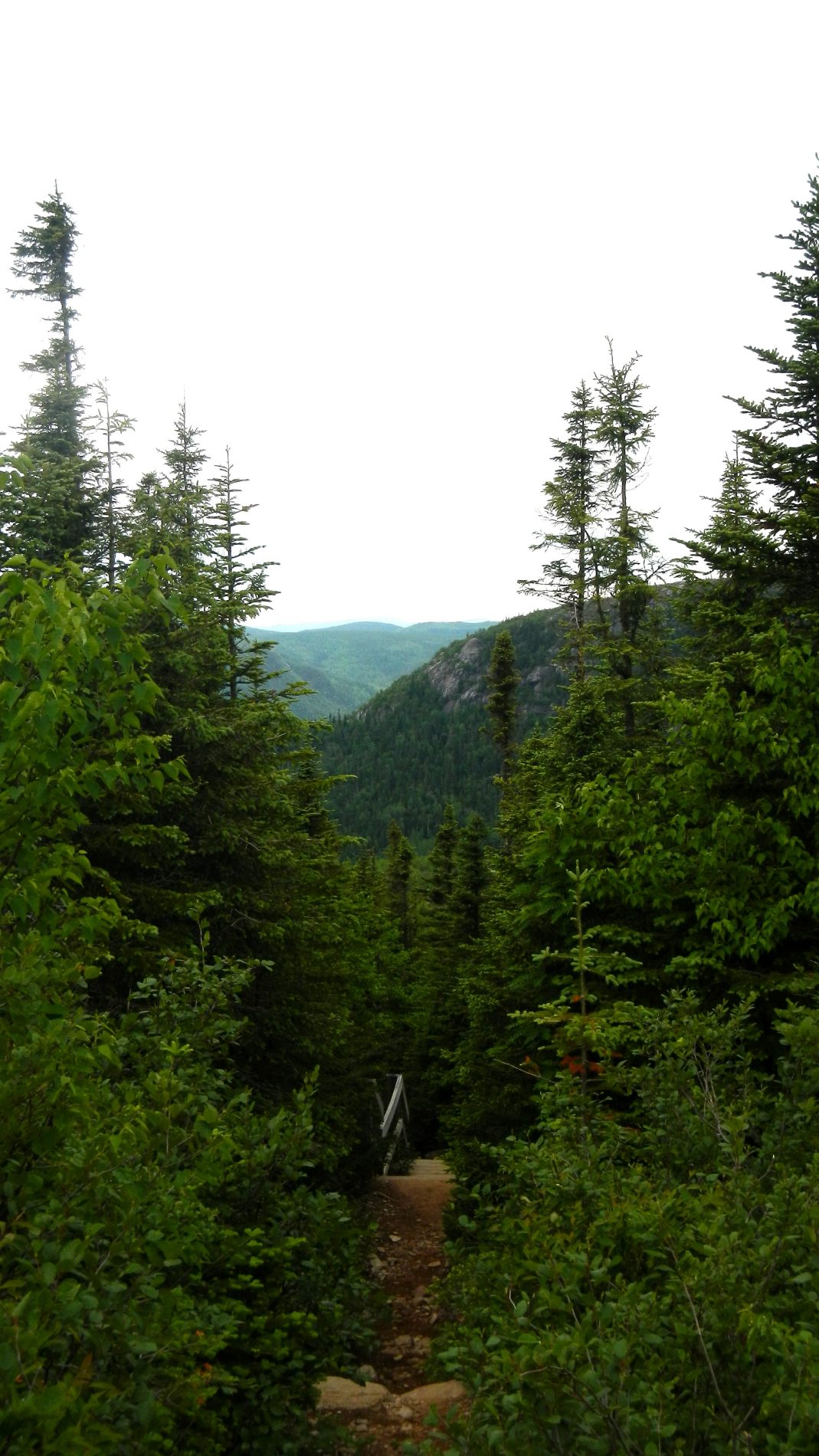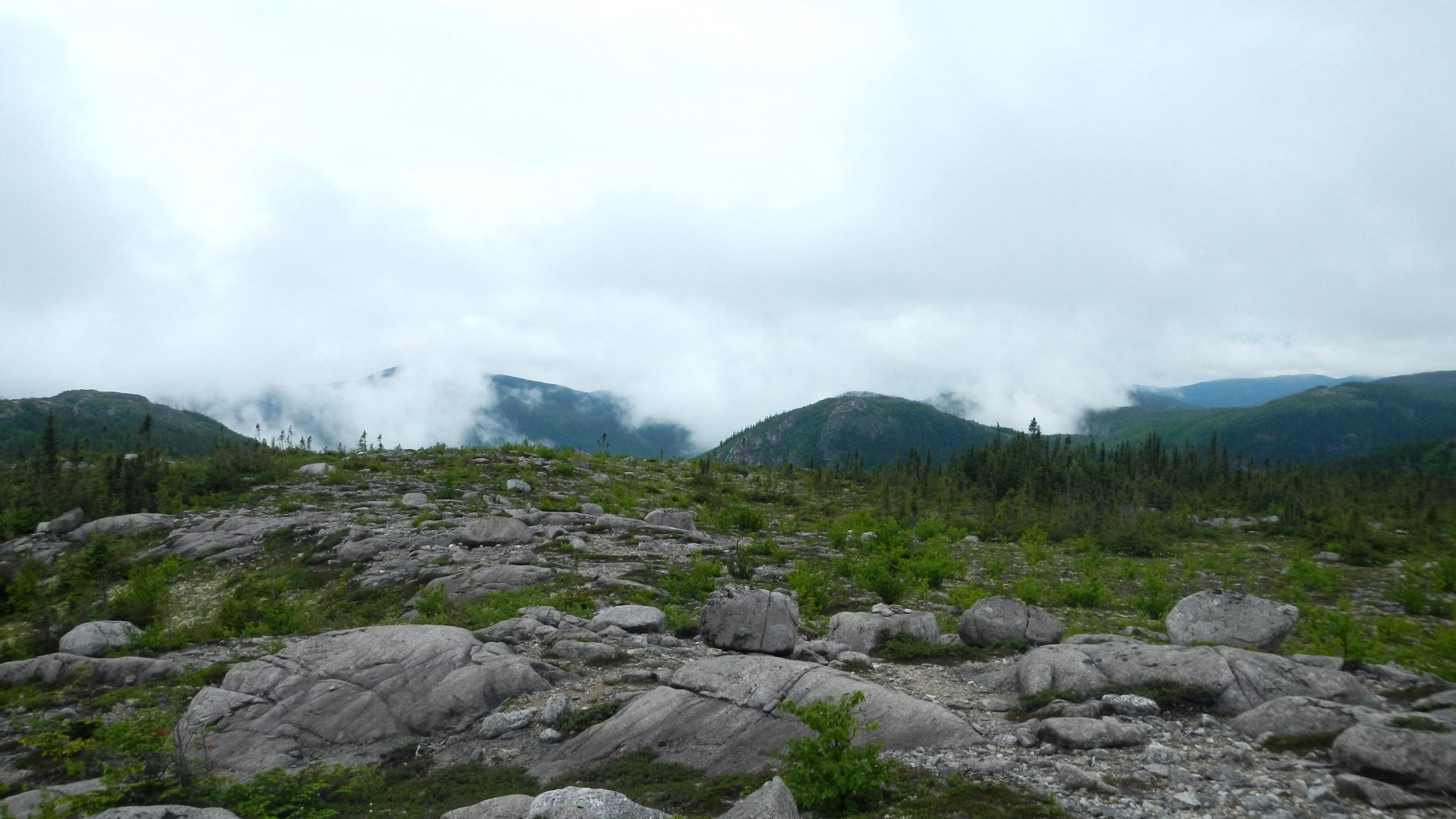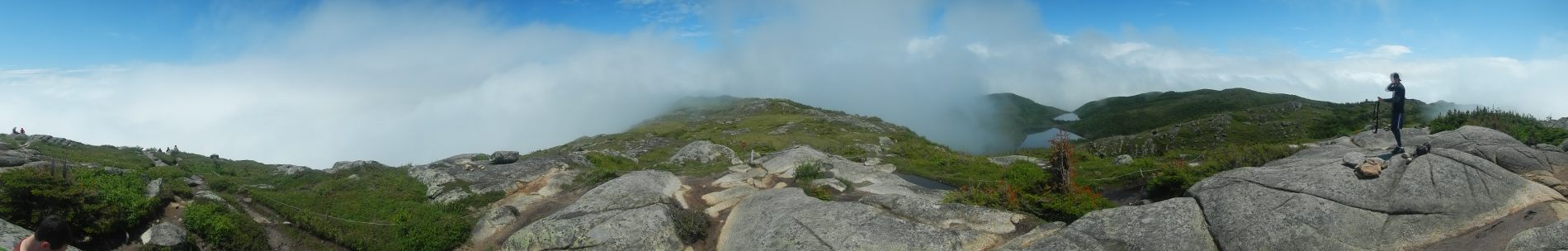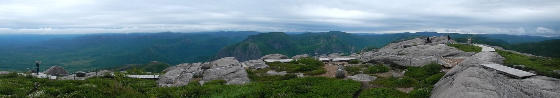 Après quelques jours on rejoint Maude et Louis-Philippe dans le Parc national des Hautes-gorges de la rivière Malbaie pour une rando au sommet avec une vue qu’on nous dit magnifique. Une météo très humide et chaude, un itinéraire qui grimpe pas mal, 800 m de dénivelé monté, un cours sur la flore de Louis-Philippe, et tout ça pourquoi ……. pour du blanc ! Merci Maude et Louis-Philippe 😉 Bien oui, quand on est dans un nuage ou à peine au dessus, tout est blanc ! C’est d’ailleurs assez impressionnant de se trouver au bord d’une falaise avec du vide blanc sous soi à ne pas savoir où est le sol. On se pose au sommet, en t-shirt, on enlève nos chaussures. Maude et Louis-Philippe n’en reviennent pas, à chaque fois qu’ils sont venus ici, c’était toujours doudoune ou polaire et veste tellement il fait froid et que le vent souffle. On imagine que le vent doit effectivement souffler aujourd’hui car les nuages dévoilent et cachent rapidement le paysage proche en arrière de nous. Après un casse-croûte, on amorce la descente qui nous semble plus longue que prévu.
