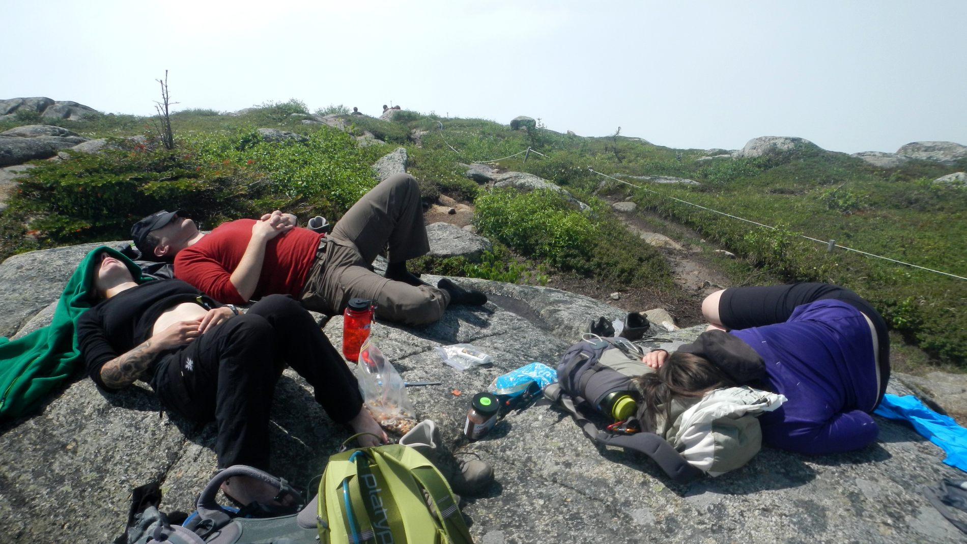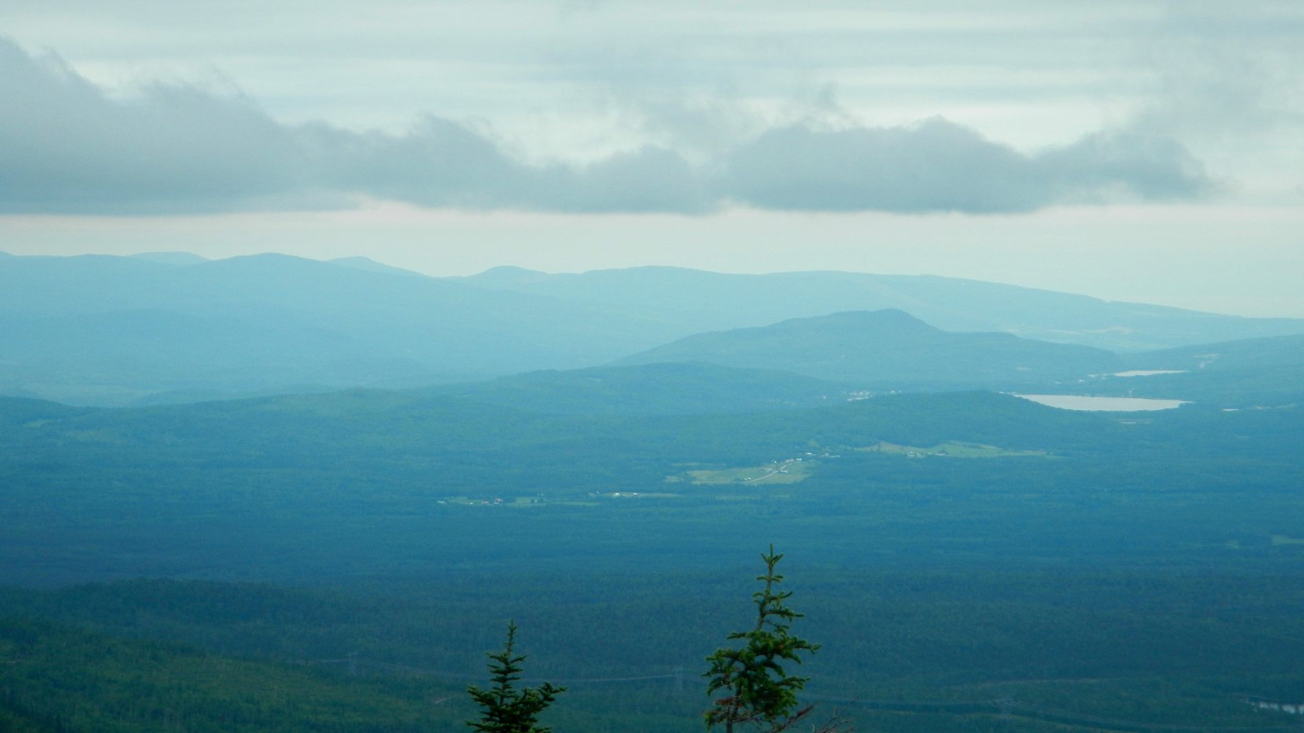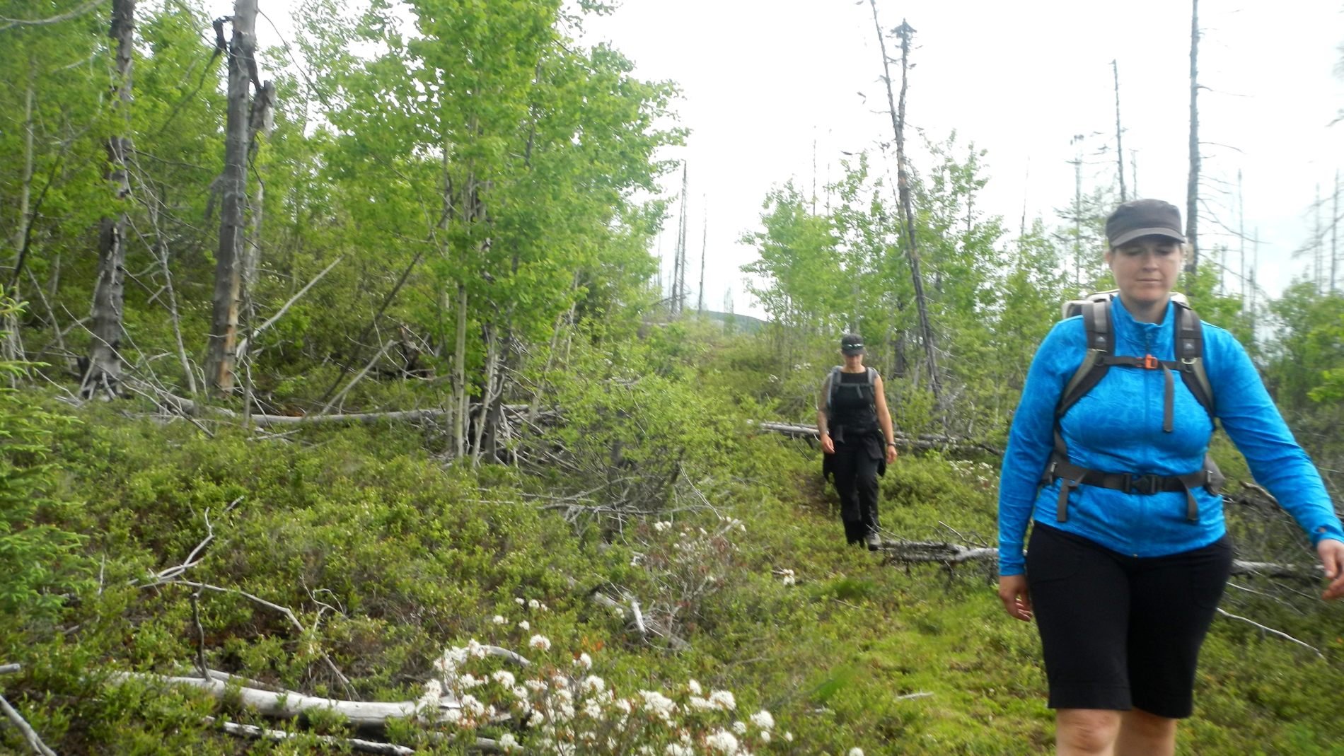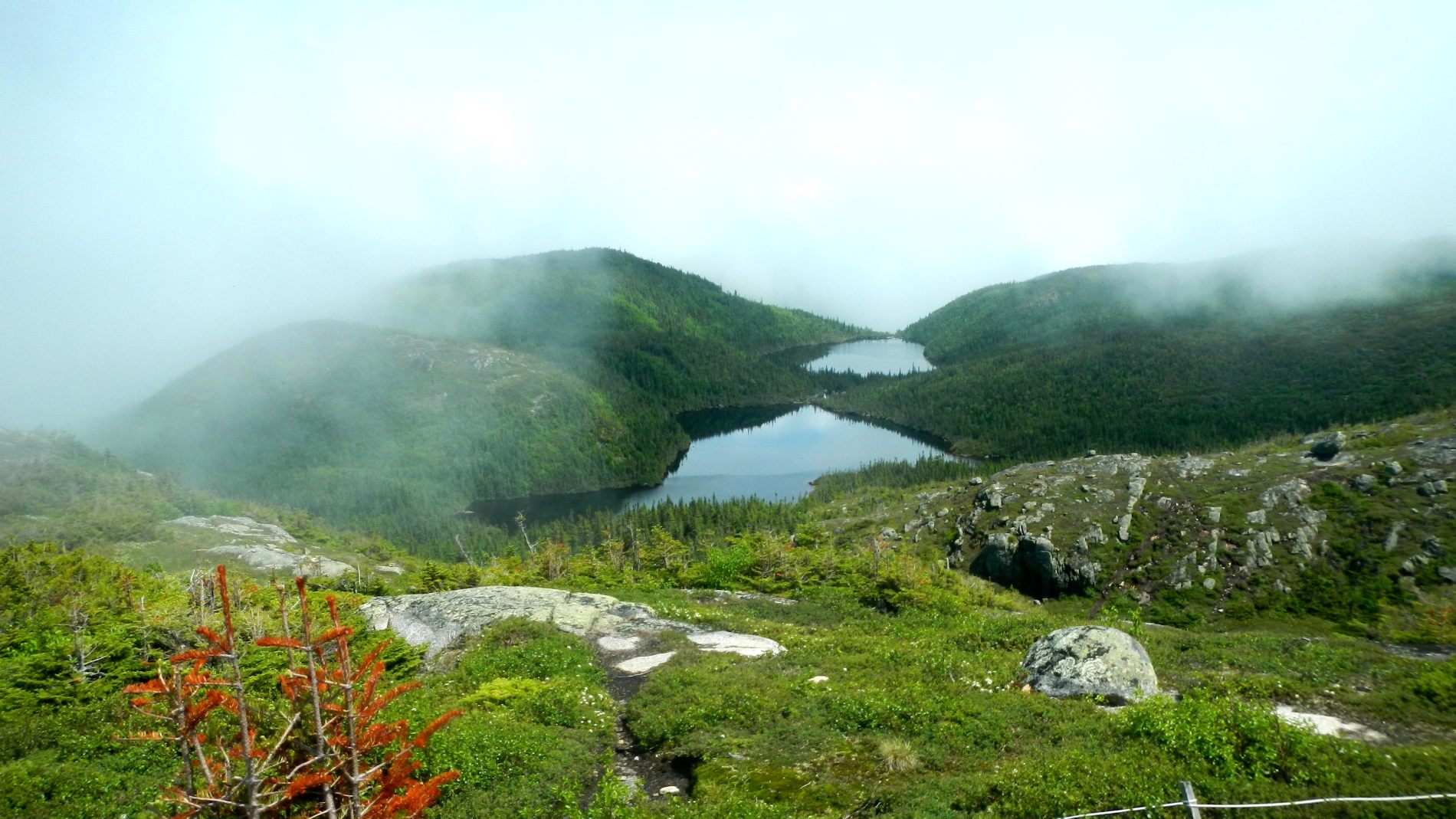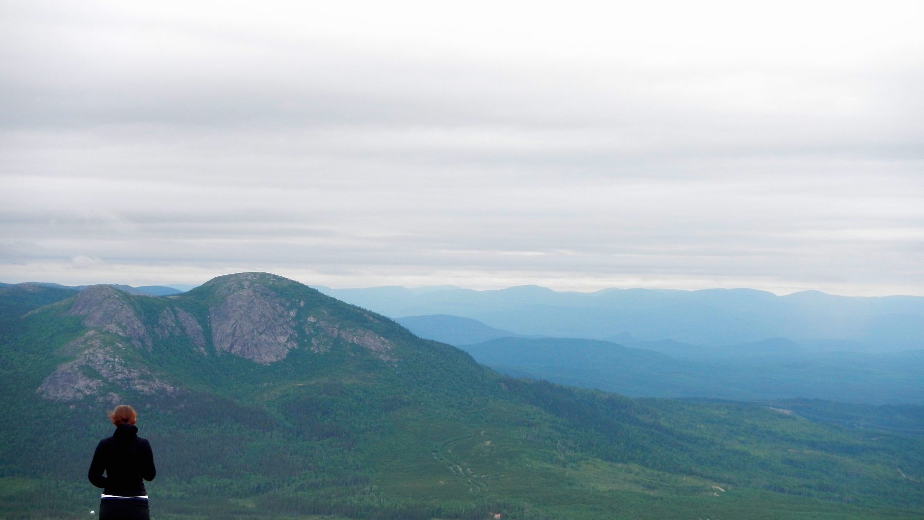Après quelques jours on rejoint Maude et Louis-Philippe dans le Parc national des Hautes-gorges de la rivière Malbaie pour une rando au sommet avec une vue qu’on nous dit magnifique. Une météo très humide et chaude, un itinéraire qui grimpe pas mal, 800 m de dénivelé monté, un cours sur la flore de Louis-Philippe, et tout ça pourquoi ……. pour du blanc ! Merci Maude et Louis-Philippe 😉 Bien oui, quand on est dans un nuage ou à peine au dessus, tout est blanc ! C’est d’ailleurs assez impressionnant de se trouver au bord d’une falaise avec du vide blanc sous soi à ne pas savoir où est le sol. On se pose au sommet, en t-shirt, on enlève nos chaussures. Maude et Louis-Philippe n’en reviennent pas, à chaque fois qu’ils sont venus ici, c’était toujours doudoune ou polaire et veste tellement il fait froid et que le vent souffle. On imagine que le vent doit effectivement souffler aujourd’hui car les nuages dévoilent et cachent rapidement le paysage proche en arrière de nous. Après un casse-croûte, on amorce la descente qui nous semble plus longue que prévu.