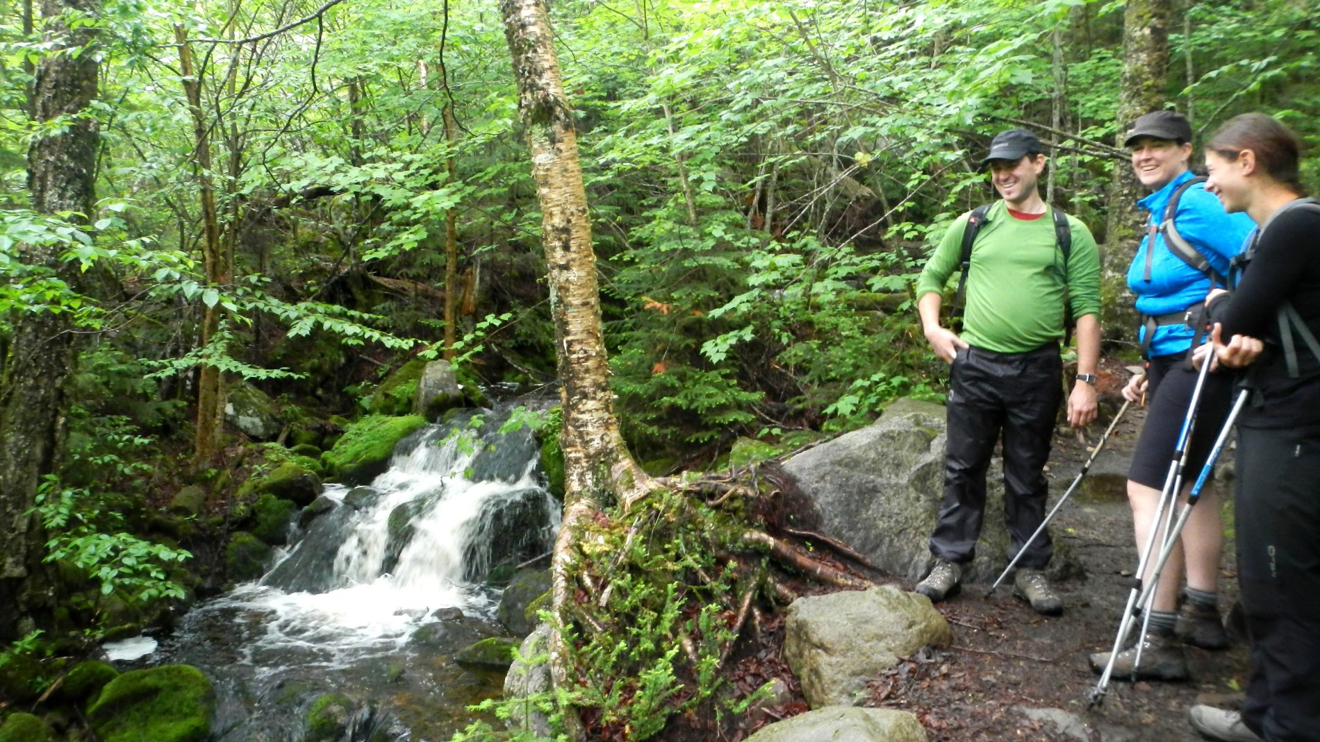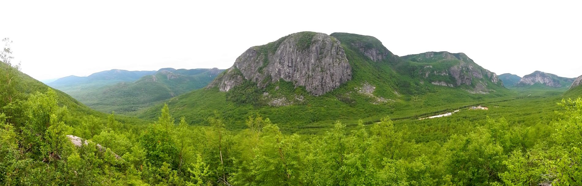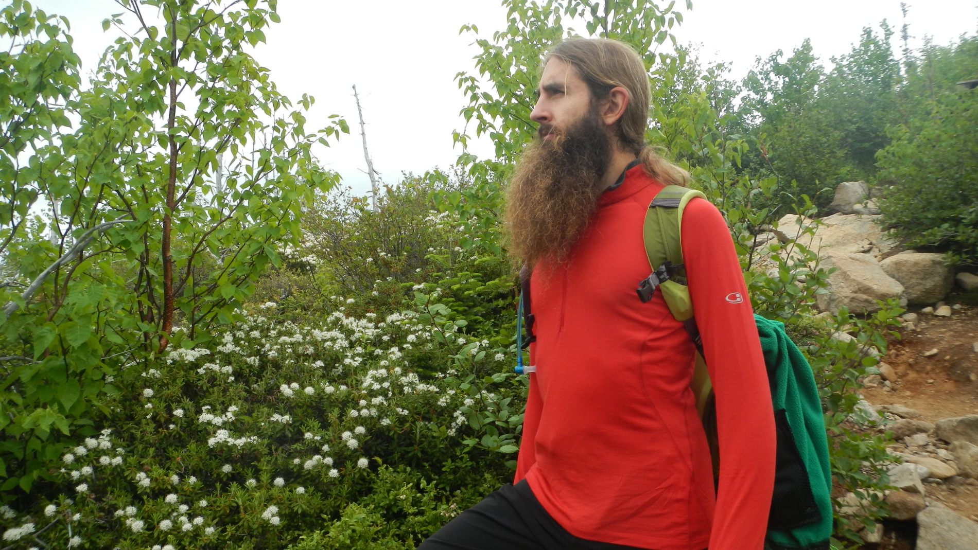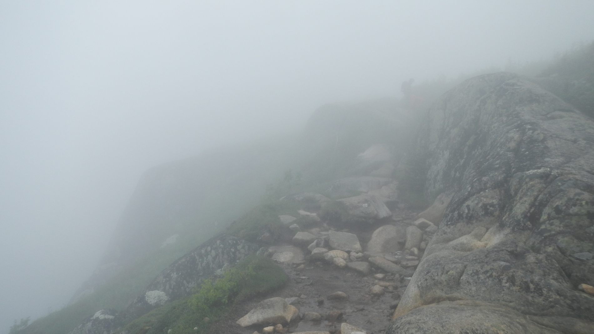 Après quelques jours on rejoint Maude et Louis-Philippe dans le Parc national des Hautes-gorges de la rivière Malbaie pour une rando au sommet avec une vue qu’on nous dit magnifique. Une météo très humide et chaude, un itinéraire qui grimpe pas mal, 800 m de dénivelé monté, un cours sur la flore de Louis-Philippe, et tout ça pourquoi ……. pour du blanc ! Merci Maude et Louis-Philippe 😉 Bien oui, quand on est dans un nuage ou à peine au dessus, tout est blanc ! C’est d’ailleurs assez impressionnant de se trouver au bord d’une falaise avec du vide blanc sous soi à ne pas savoir où est le sol. On se pose au sommet, en t-shirt, on enlève nos chaussures. Maude et Louis-Philippe n’en reviennent pas, à chaque fois qu’ils sont venus ici, c’était toujours doudoune ou polaire et veste tellement il fait froid et que le vent souffle. On imagine que le vent doit effectivement souffler aujourd’hui car les nuages dévoilent et cachent rapidement le paysage proche en arrière de nous. Après un casse-croûte, on amorce la descente qui nous semble plus longue que prévu.